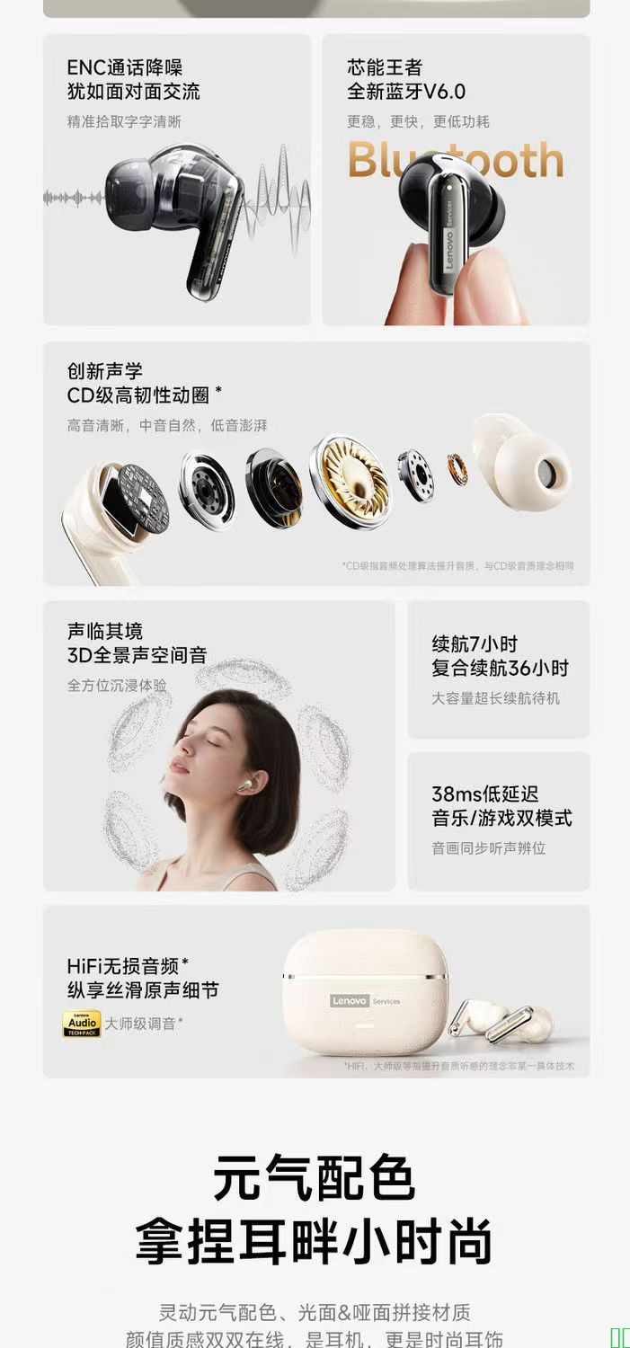 【限时抢购】联想无线音乐蓝牙耳机入耳式降噪高音质超长续航HT66