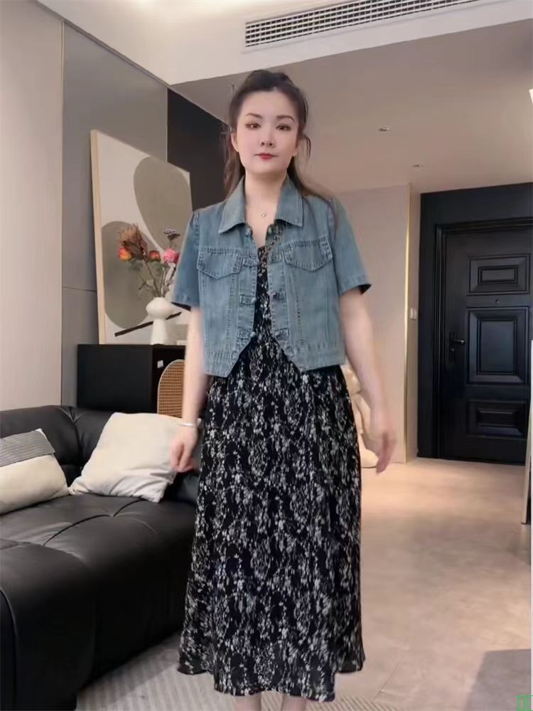 夏款小清新甜美碎花雪纺长袖针织吊带马甲两件套连衣裙女学生