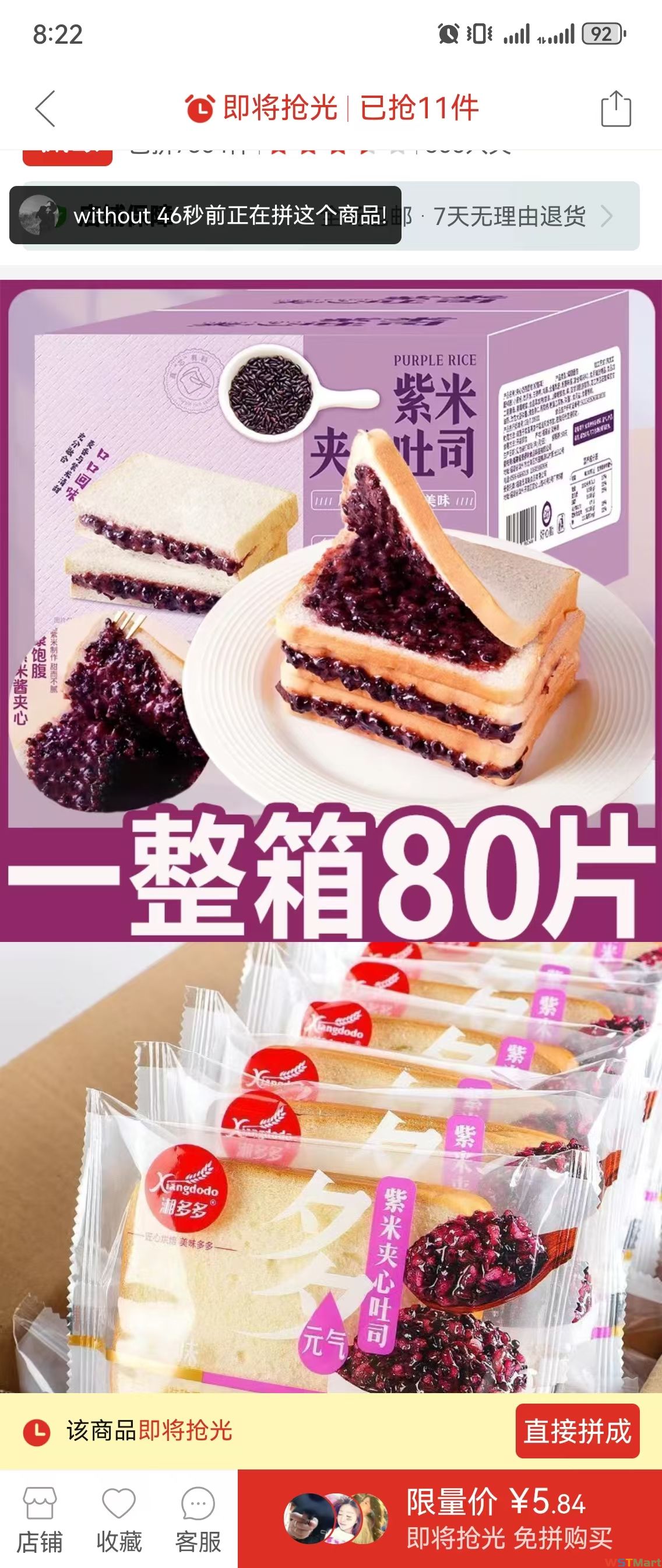 整箱80片】紫米面包吐司6片早餐软面包整箱批发价学生宿舍囤货