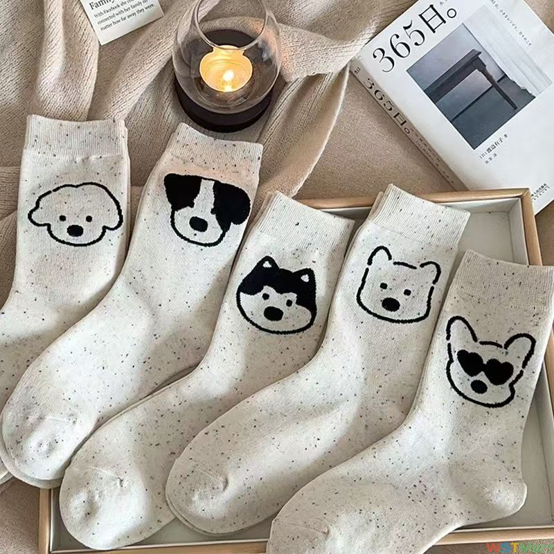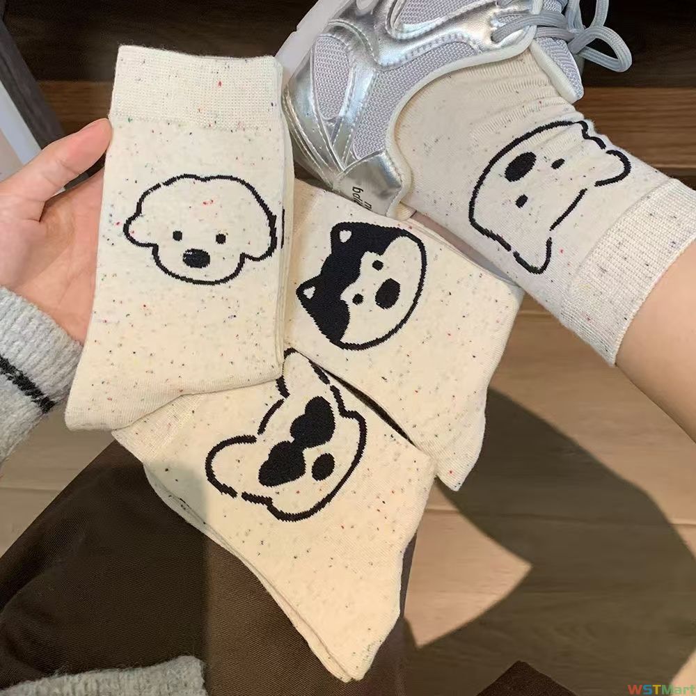袜子女秋冬中筒冬季卡通中筒加绒保暖加厚小狗袜子地板袜可爱提花