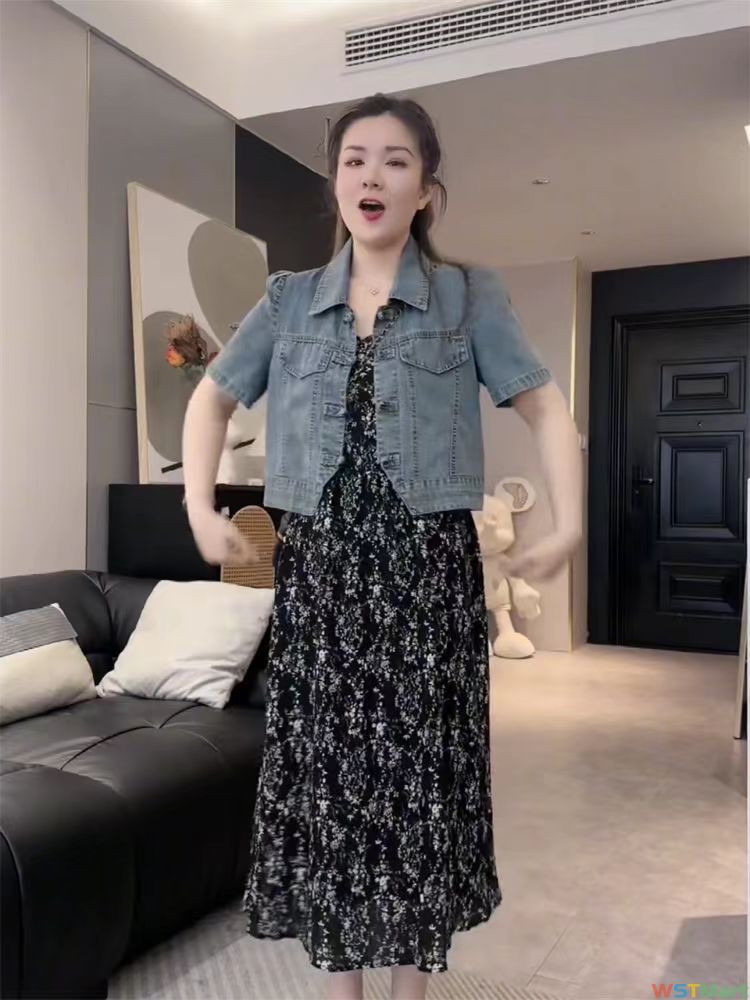 2024夏款小清新甜美碎花雪纺长袖针织吊带马甲两件套连衣裙女学生