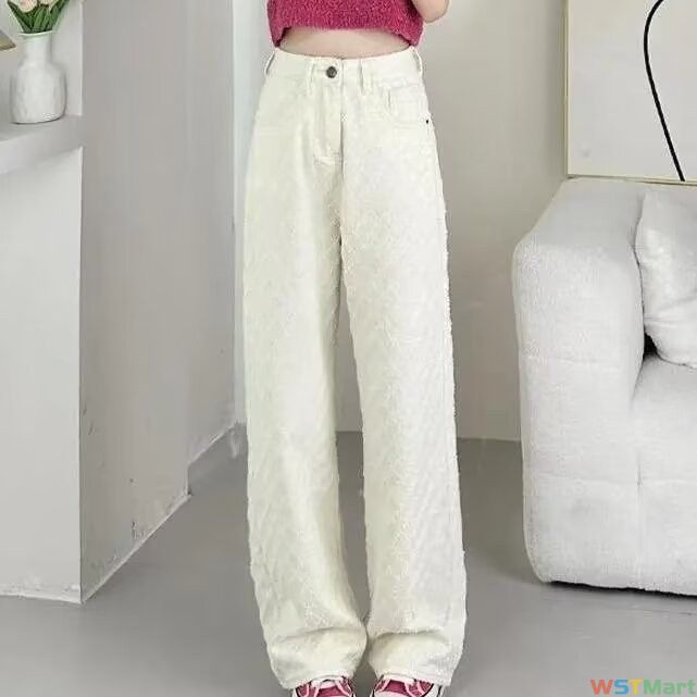 阔腿牛仔裤女夏季春秋2024年新款薄款提花杏色显瘦设计感直筒裤子