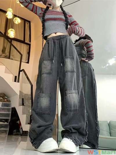 春秋牛仔裤女中性休闲潮流直筒阔腿9分宽松港风复古潮拖地裤