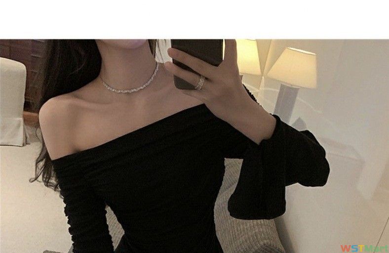 春秋新款纯欲风女辣妹一字领漏肩褶皱显瘦喇叭长袖A字显瘦连衣裙