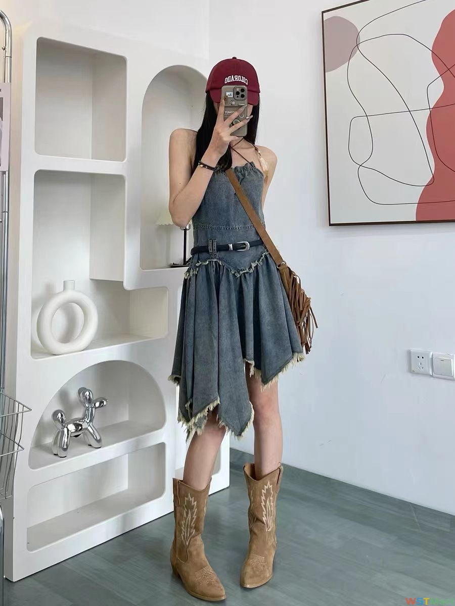 新品设计感做旧流苏牛仔连衣裙女夏季辣妹收腰吊带裙不规则中款长