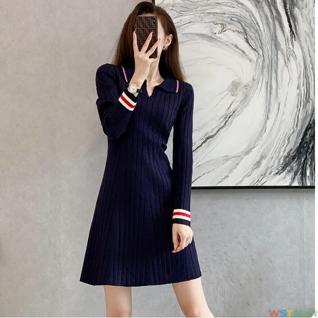 修身显瘦a字针织连衣裙2024秋季新款女装翻领气质长袖打底毛衣裙