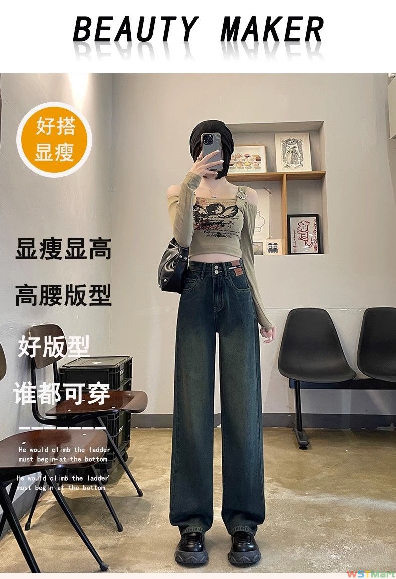 水泥灰窄版直筒裤女秋装2023年新款腰显瘦拖地阔腿牛仔裤小个子