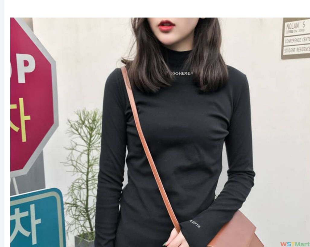 2023早秋装半领上衣打底衫女字母绣花修身学生纯色长袖t恤女潮