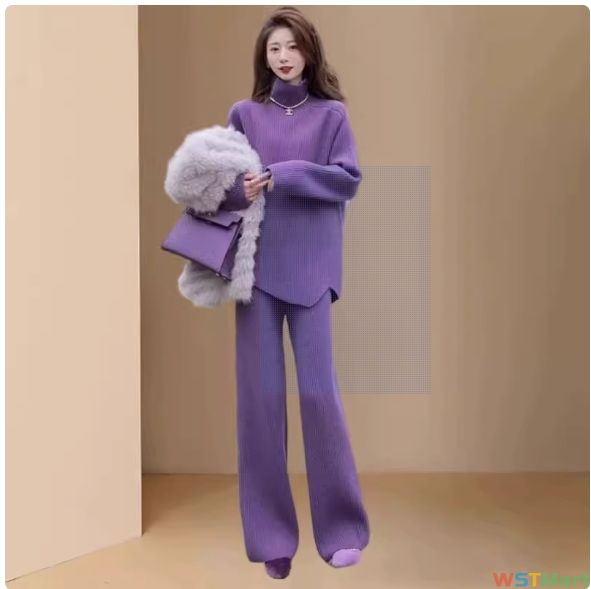 品牌高端女装2024年新款秋季时尚气质温柔紫色针织上衣裤子两件套