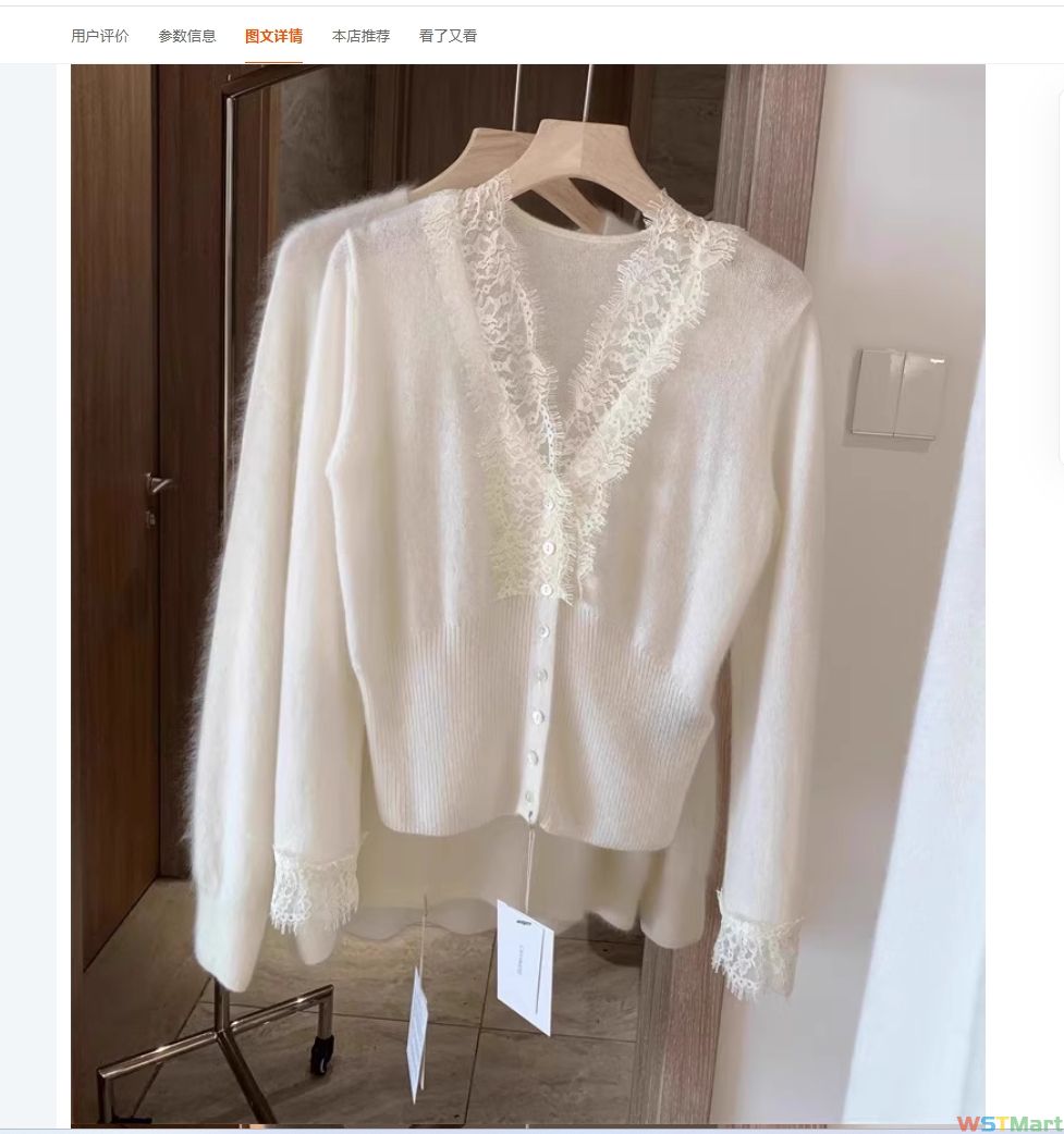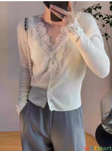 白领哥弟新女装显瘦山羊绒拼接蕾丝v领针织短开衫打底衫毛衣上衣