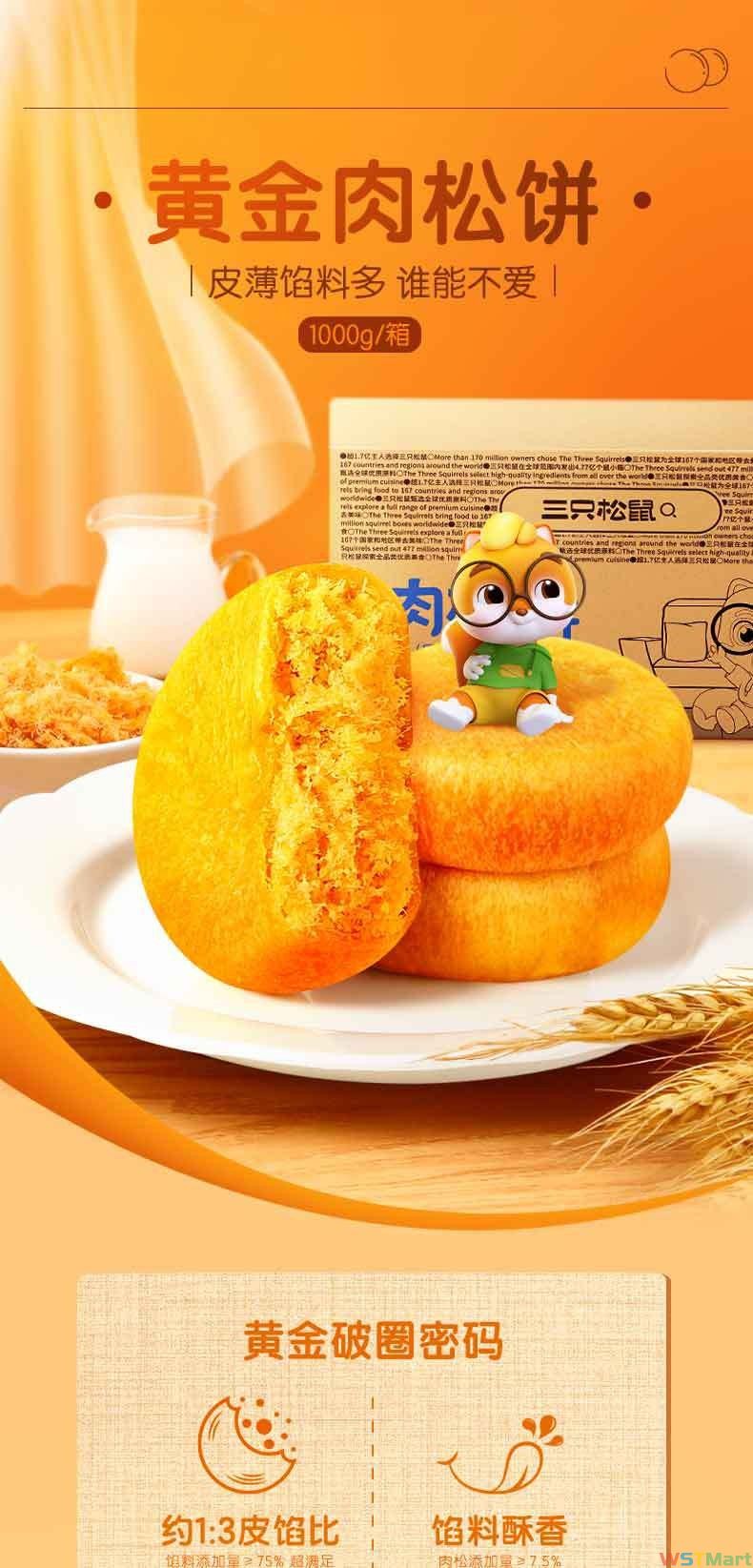 三只松鼠黄金肉松饼1kg/箱休闲零食独立小包装早餐零食