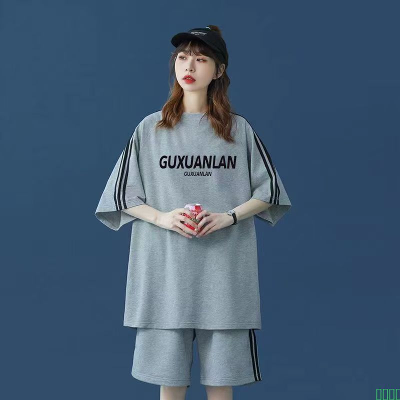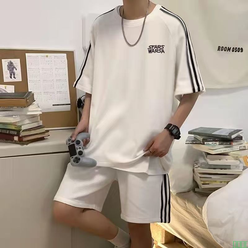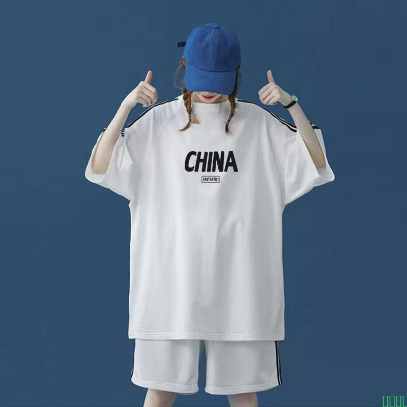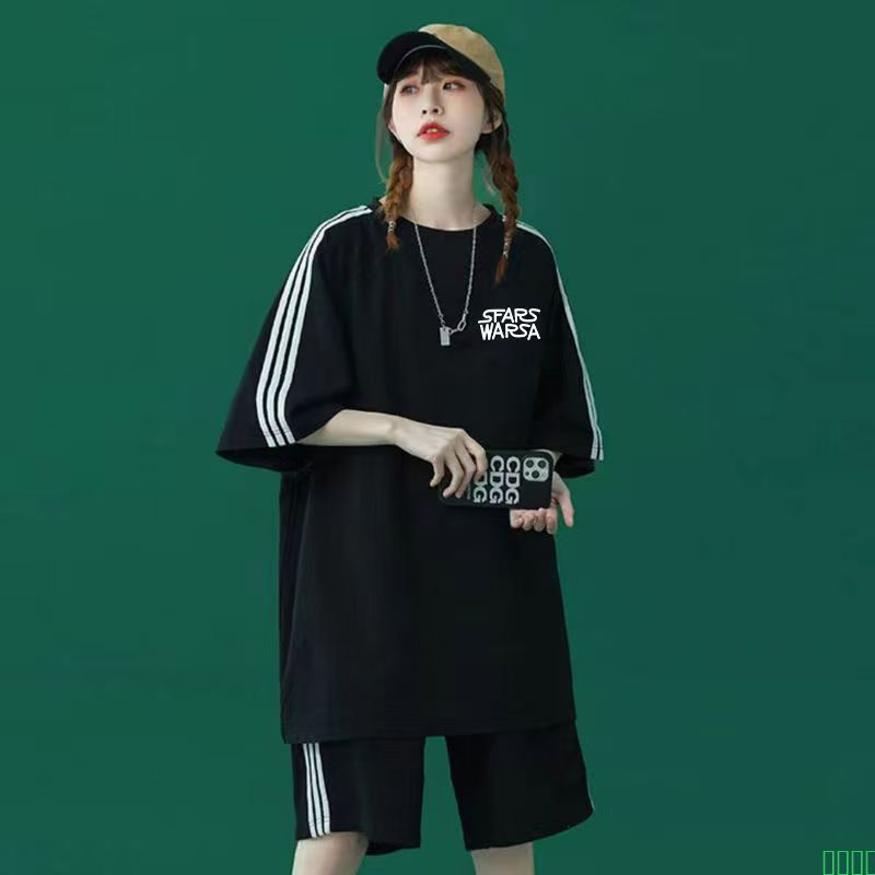 夏季港风短袖T恤男女套装潮流宽松ins学生三条杠短裤女薄款情侣装