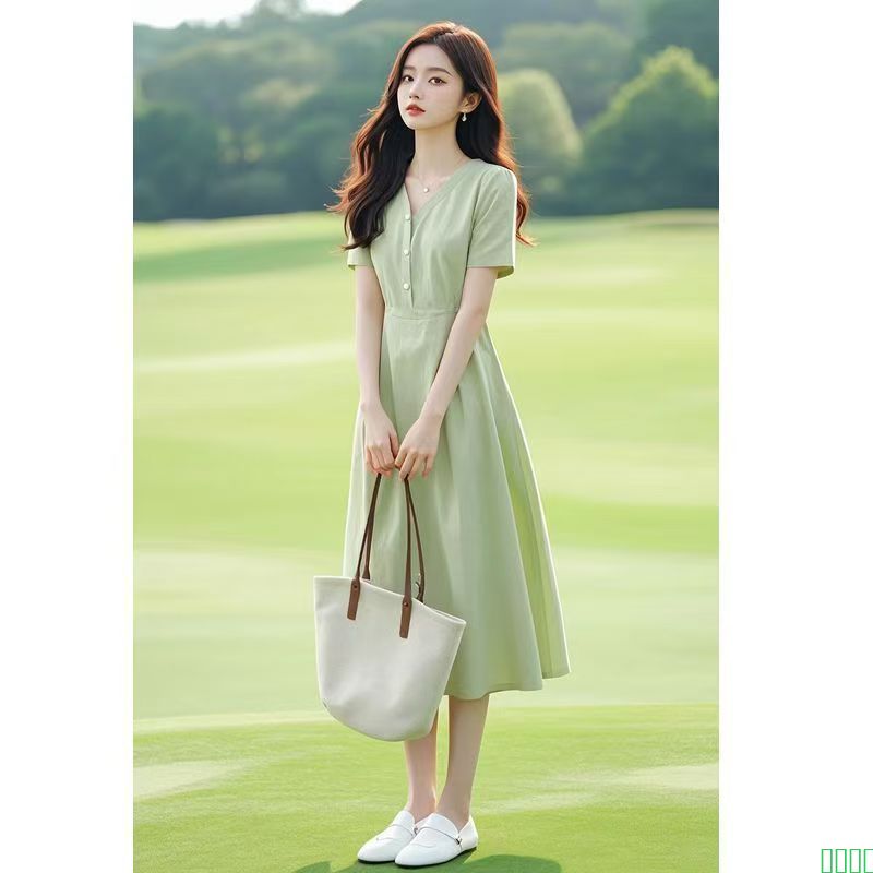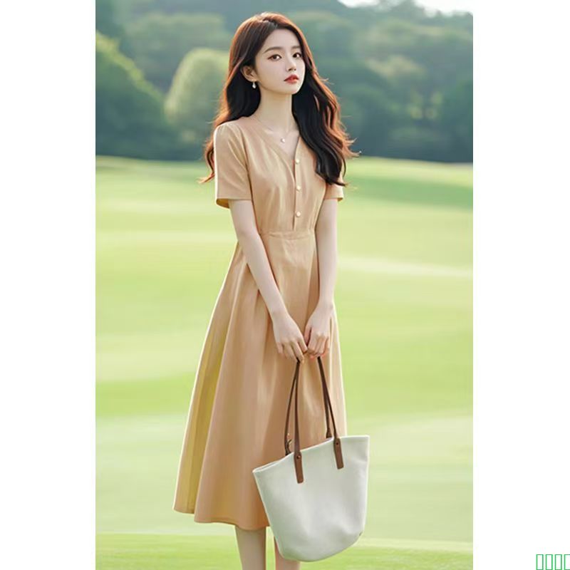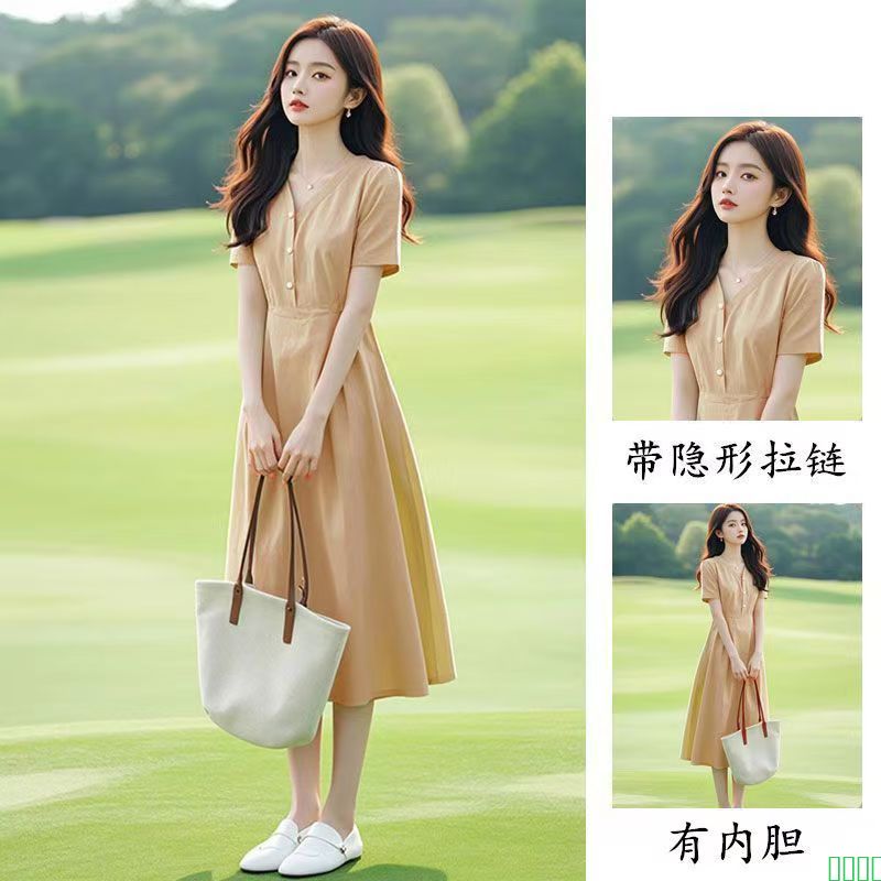 法式端庄大气小个子显高海边度假百搭v领休闲收腰连衣裙子女夏季