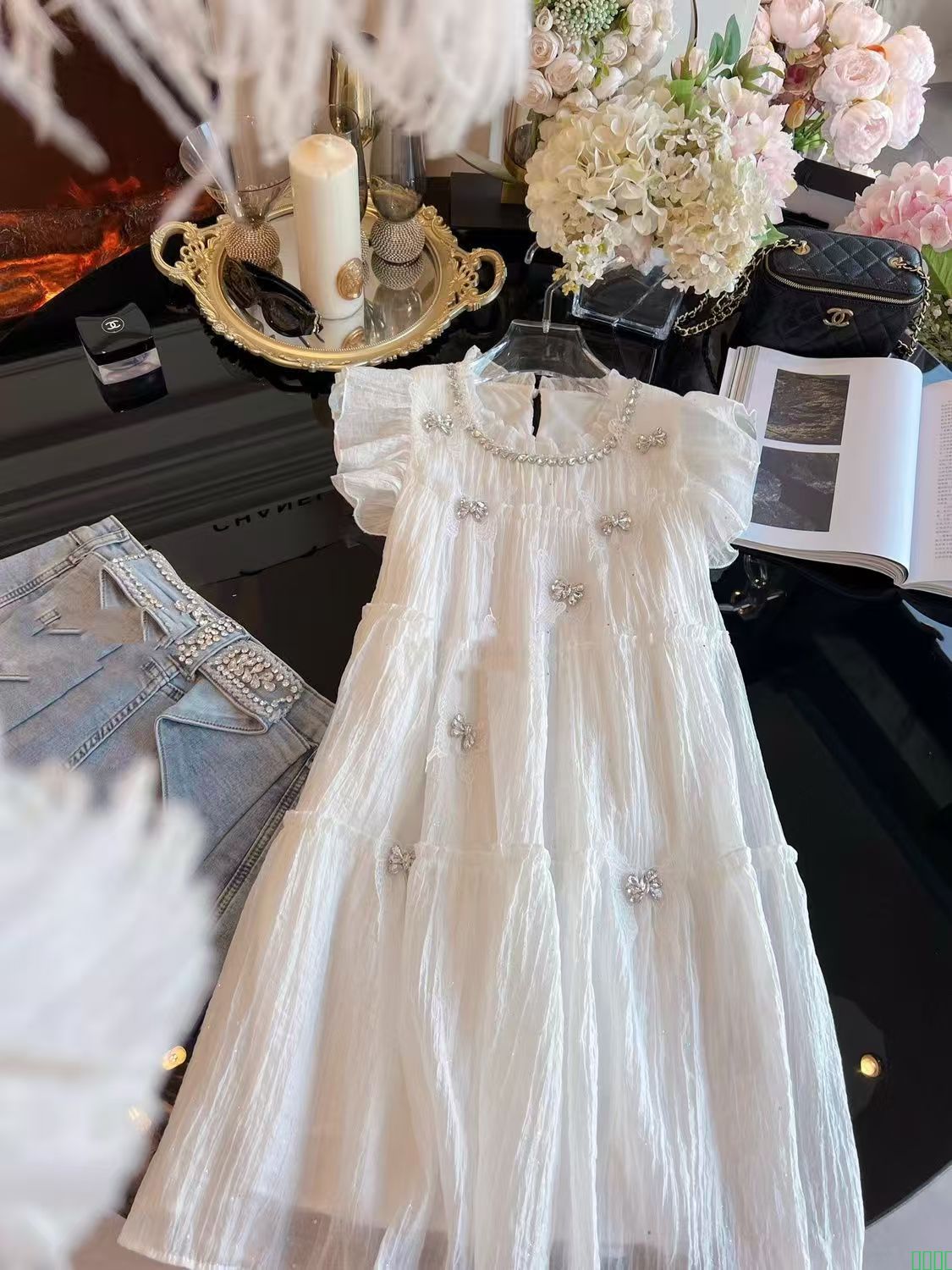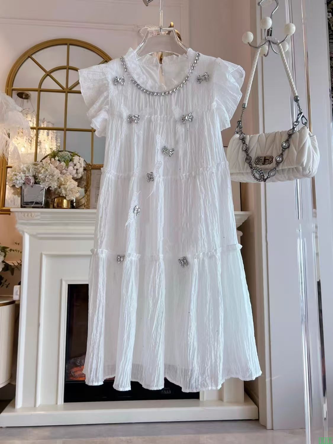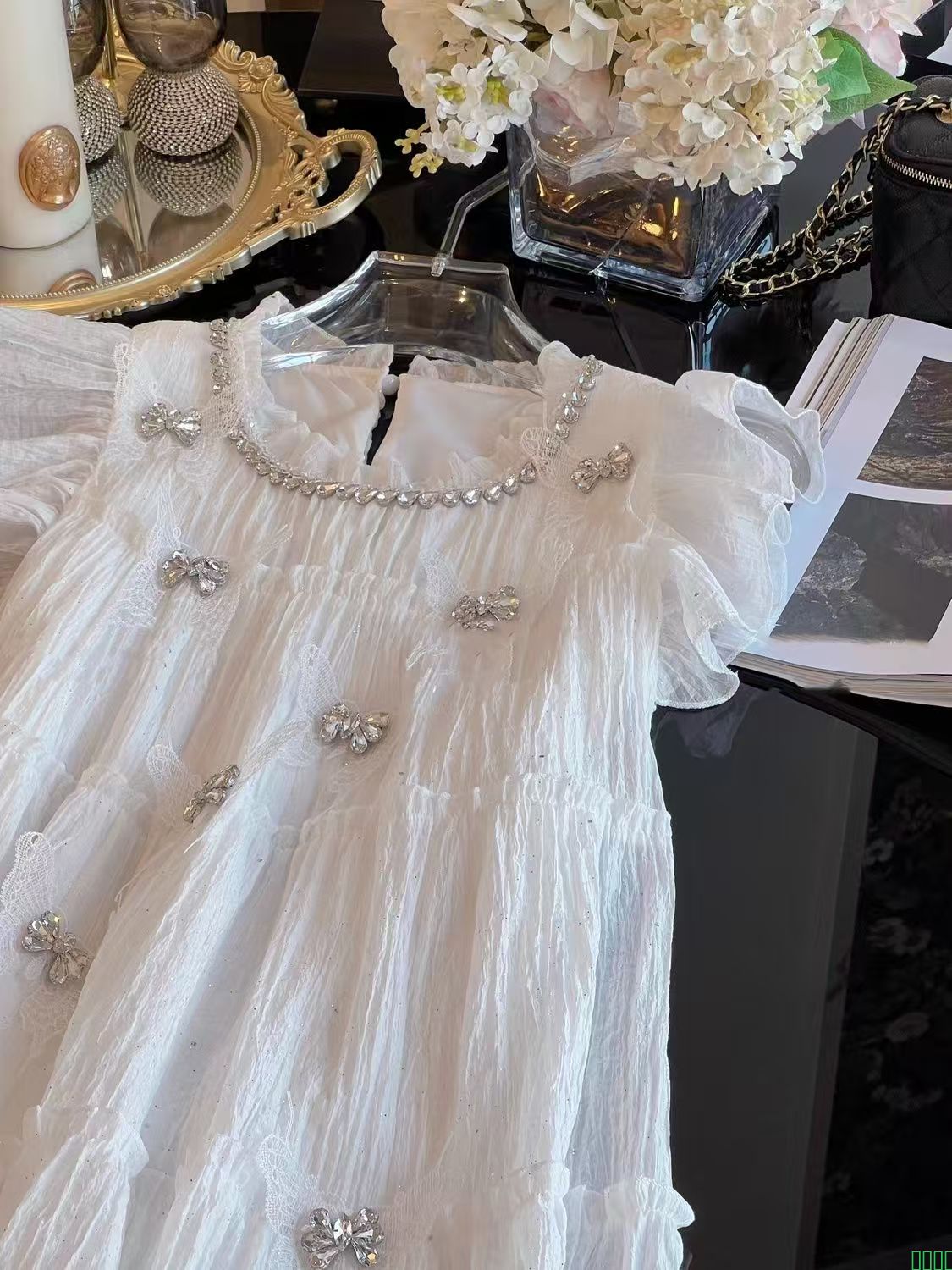 法式优雅风仙气烫钻网纱蝴蝶圆领飞飞袖连衣裙女2025夏季新款裙子