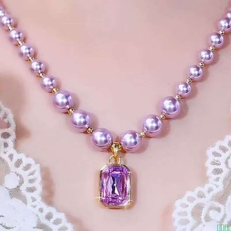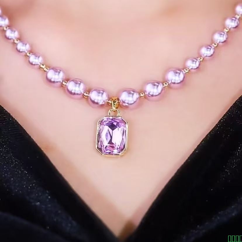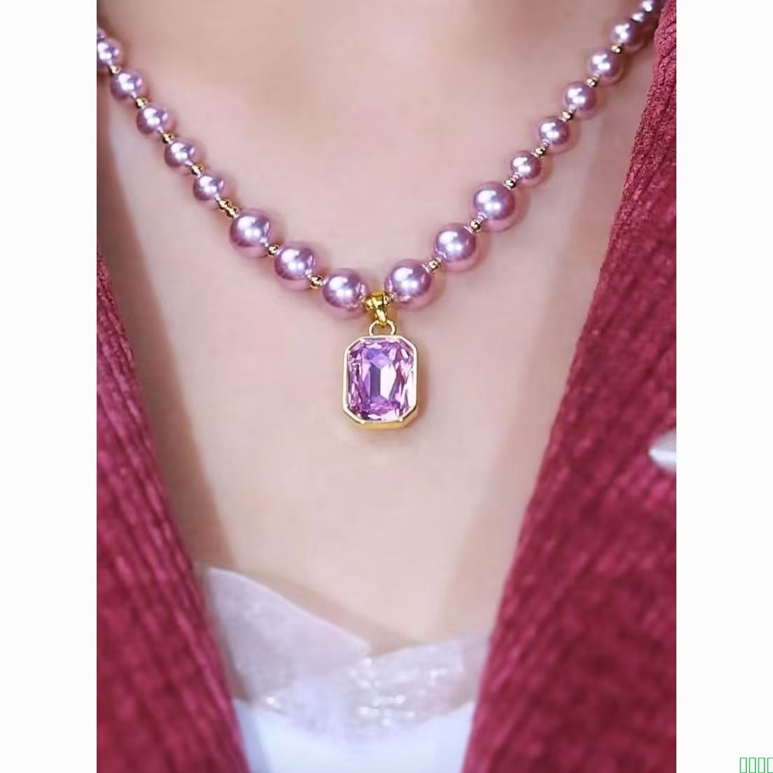 新款紫色珍珠方形水晶方块项链简约紫霞仙子锁骨链气质百搭毛衣链