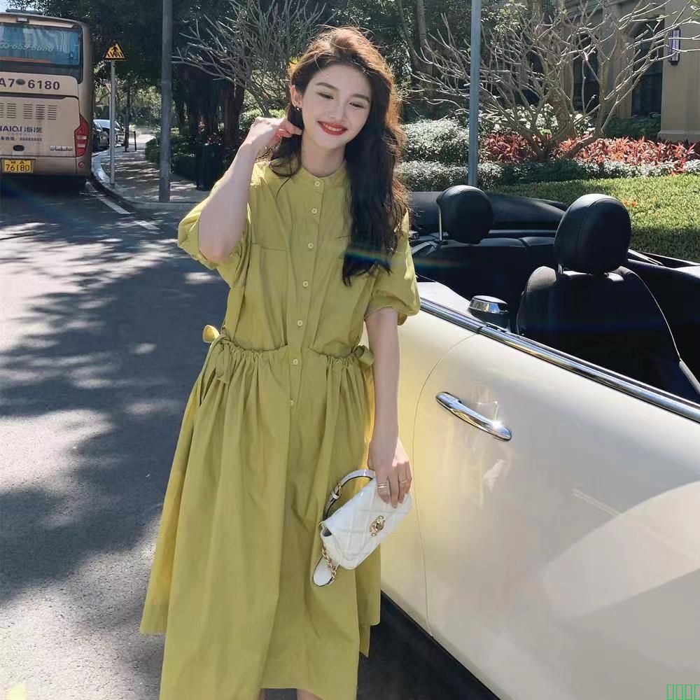 春夏季法式高级感气质连衣裙茶歇收腰泡泡袖小个子黑色长裙子
