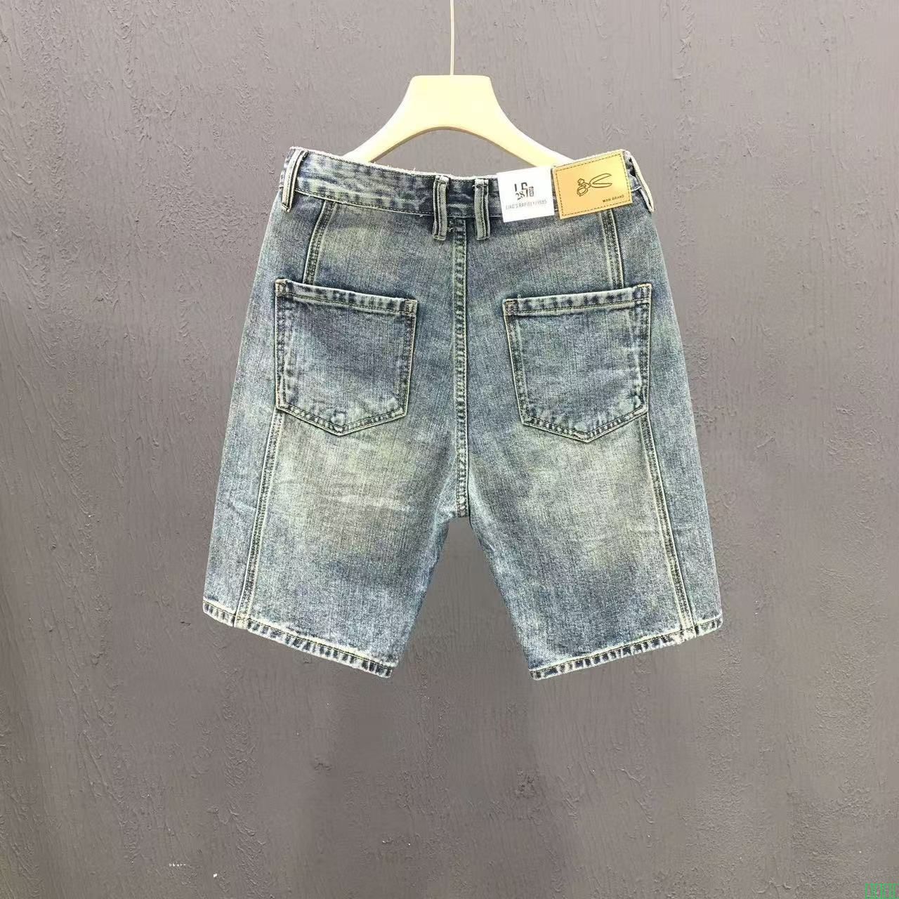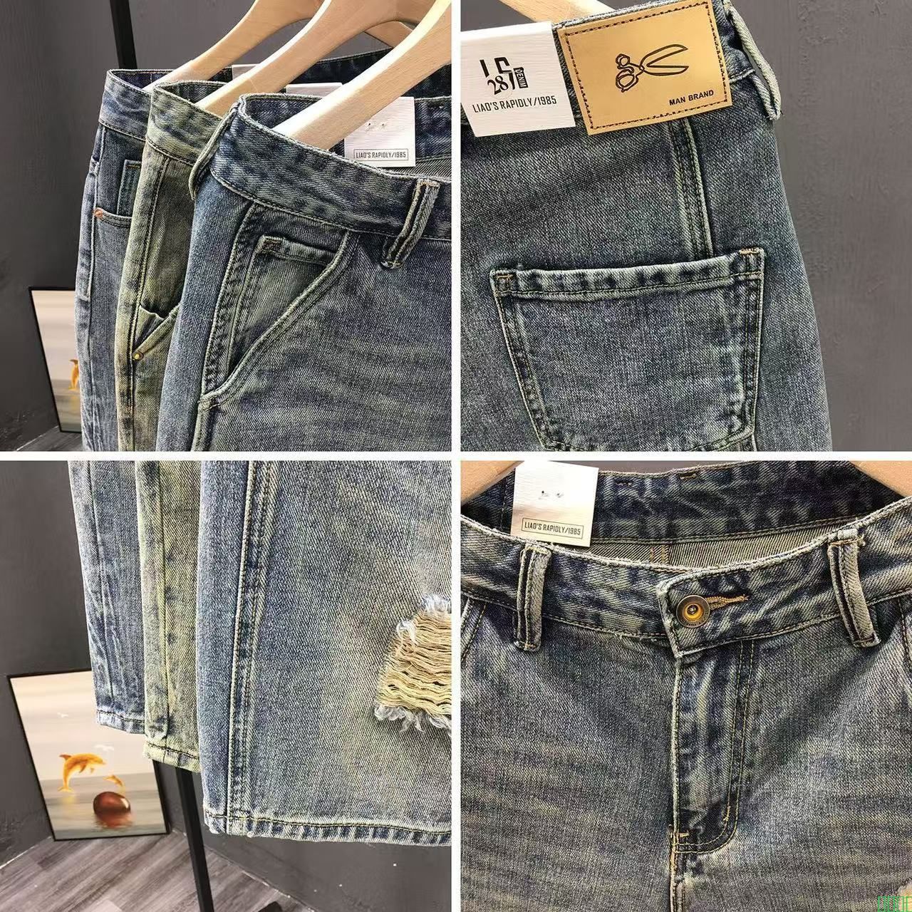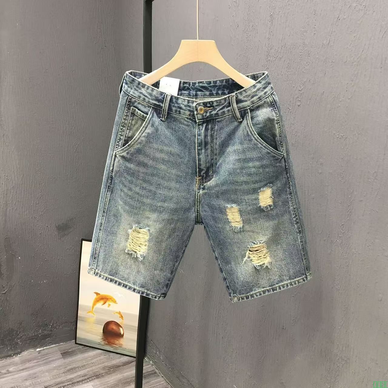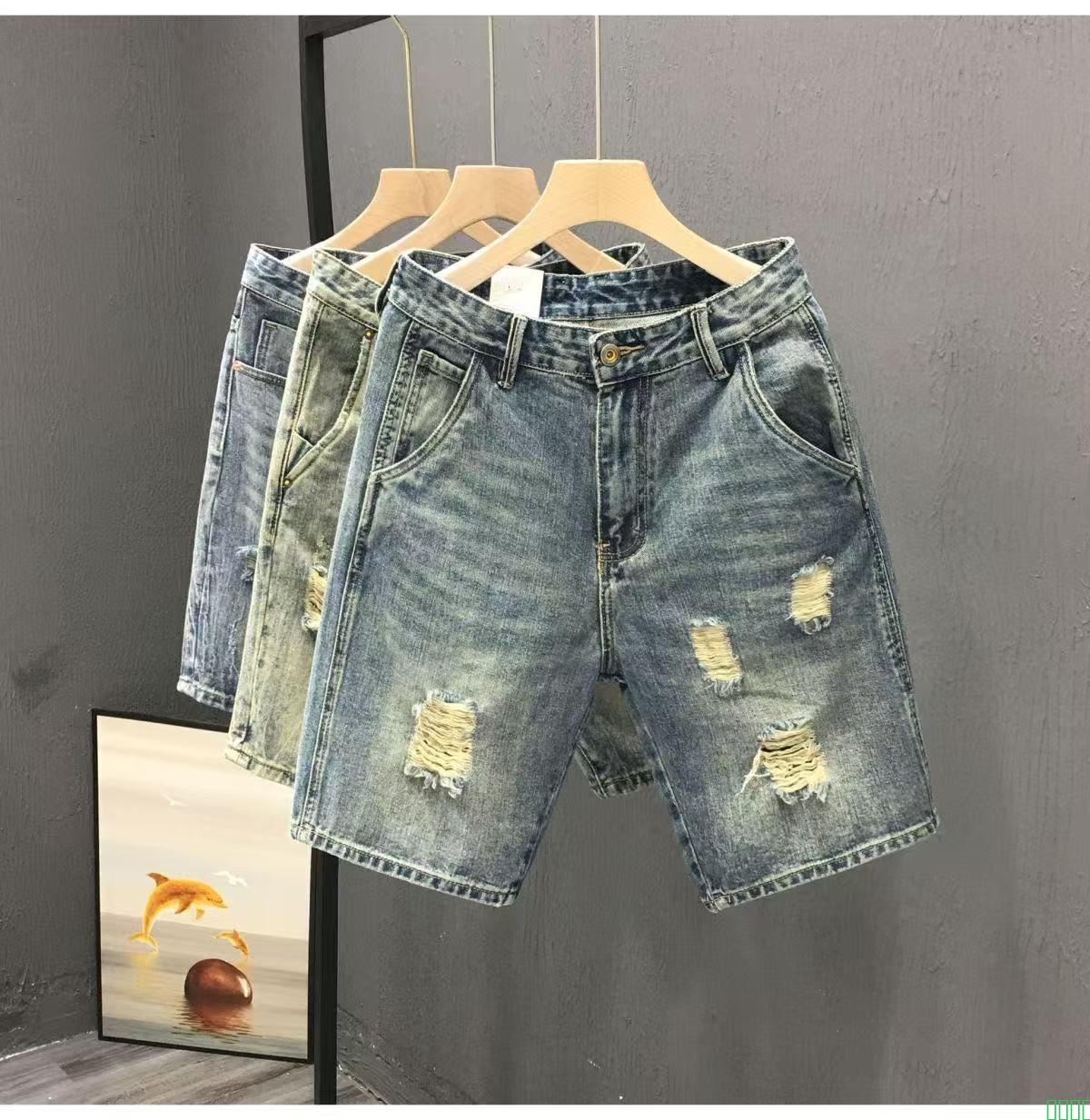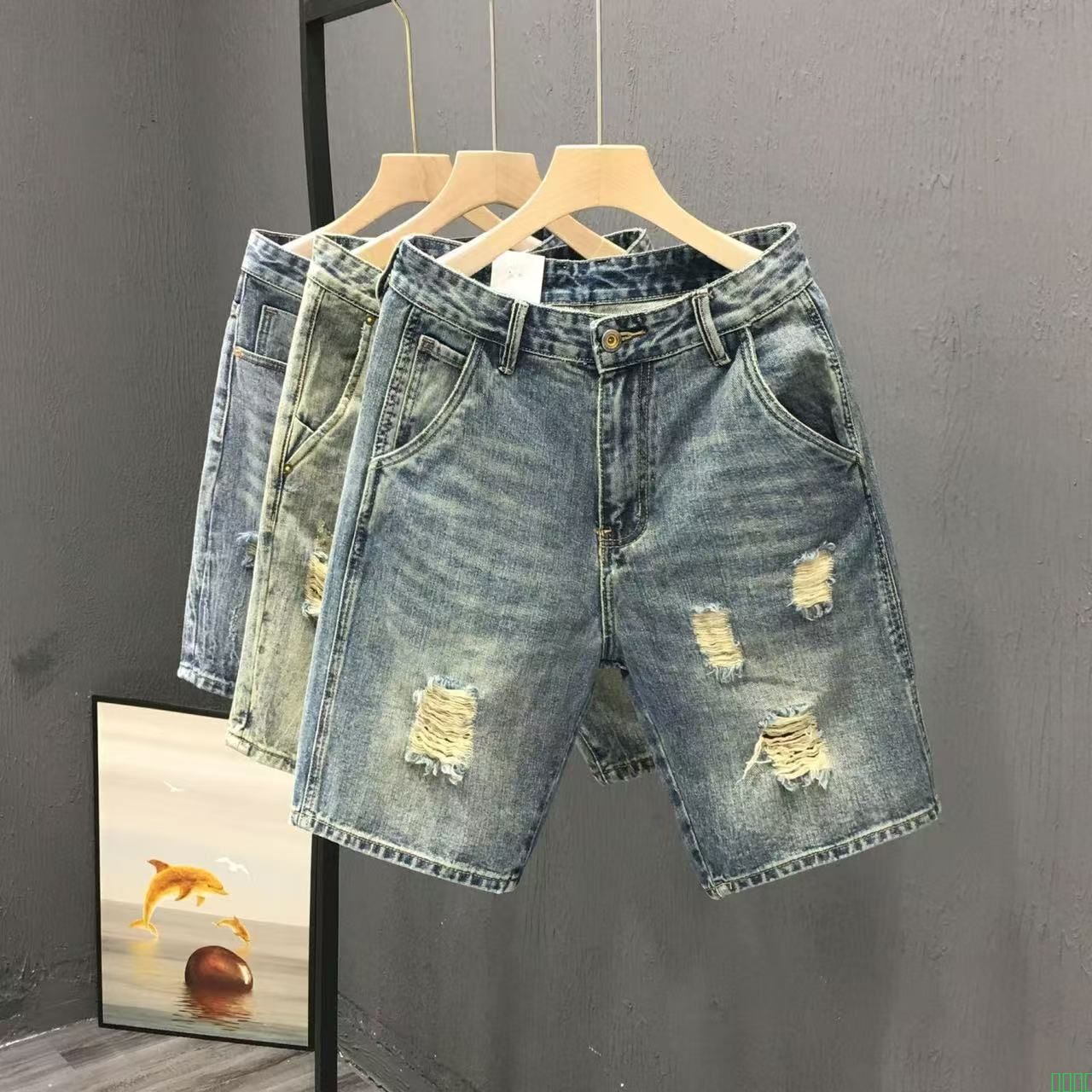 潮牌夏季男士休闲破洞牛仔短裤男款水洗五分牛仔裤复古五分裤中裤