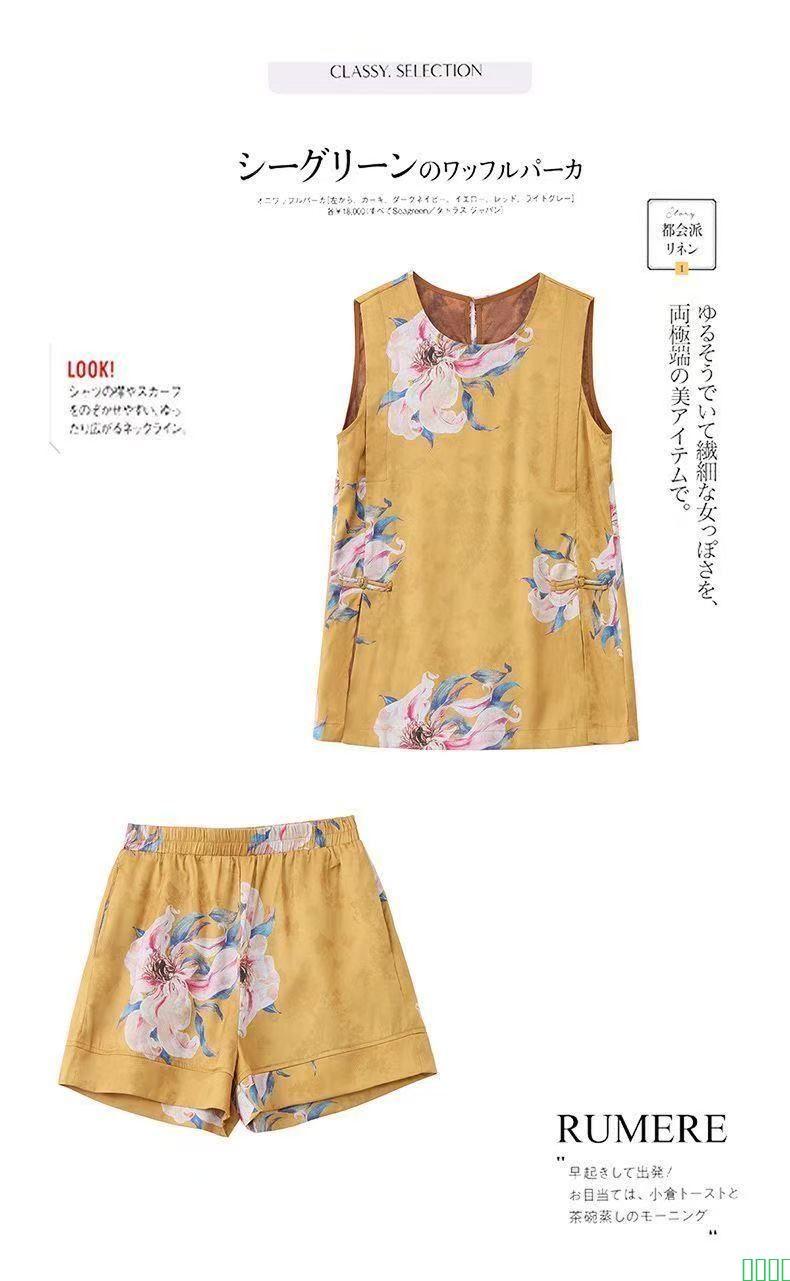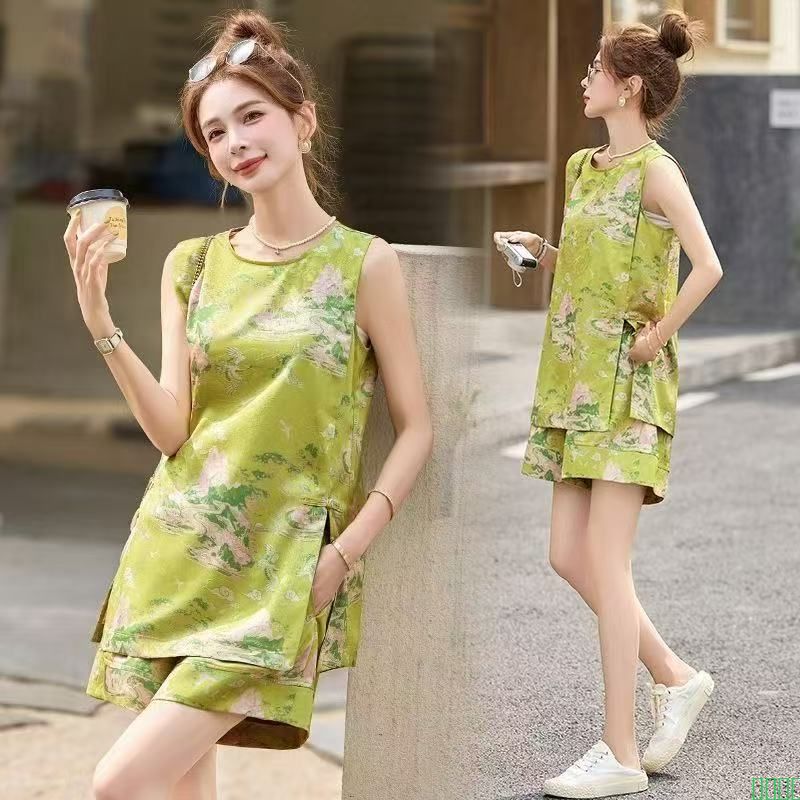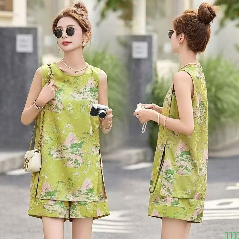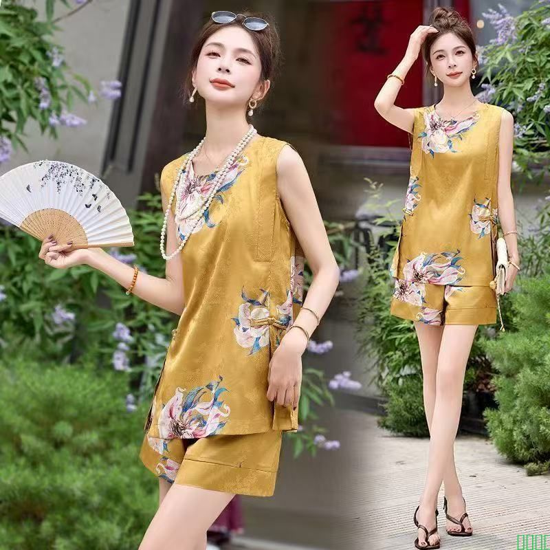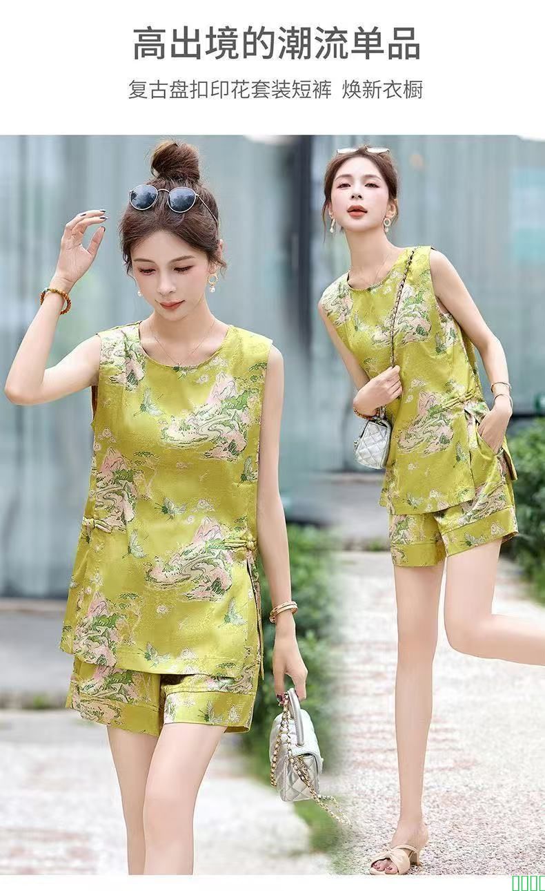 女士中式国风夏季新款复古气质印花无袖上衣短裤套装两件套2025新