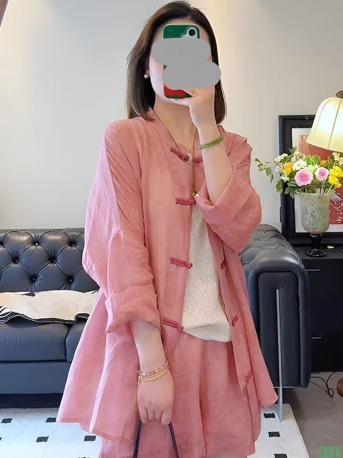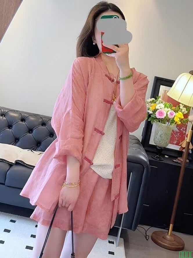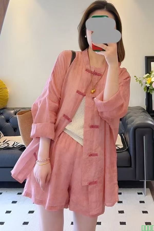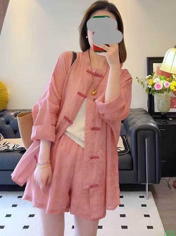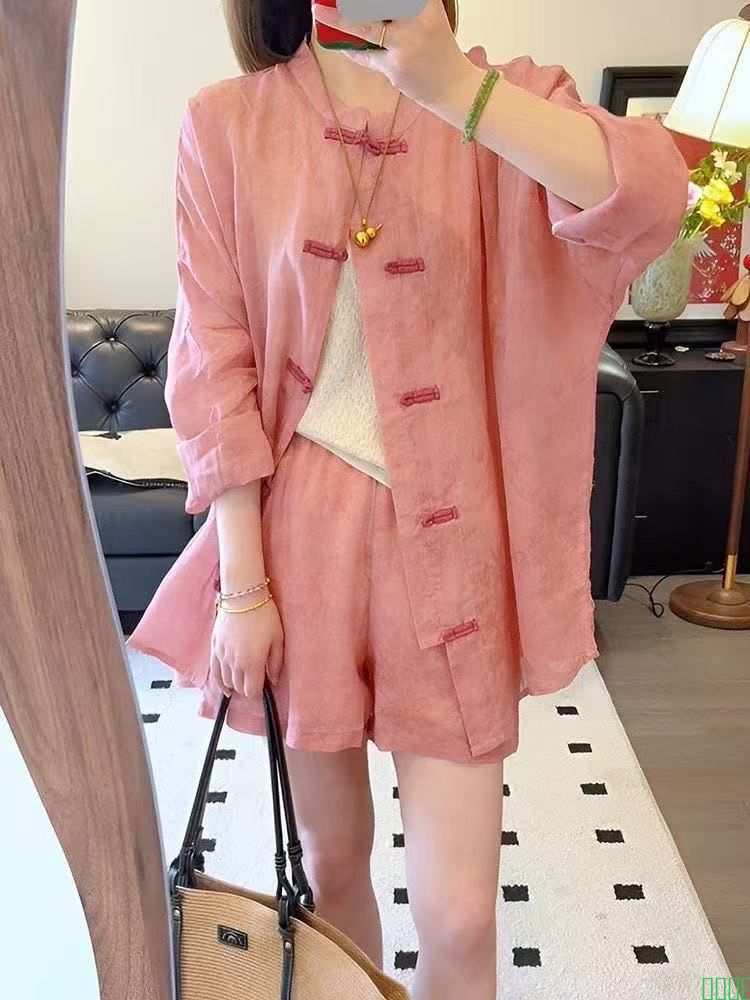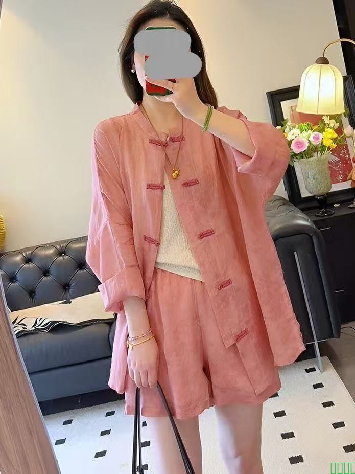 新中式复古套装女粉色盘扣防晒衬衫一整套ootd穿搭新款高级短裤潮