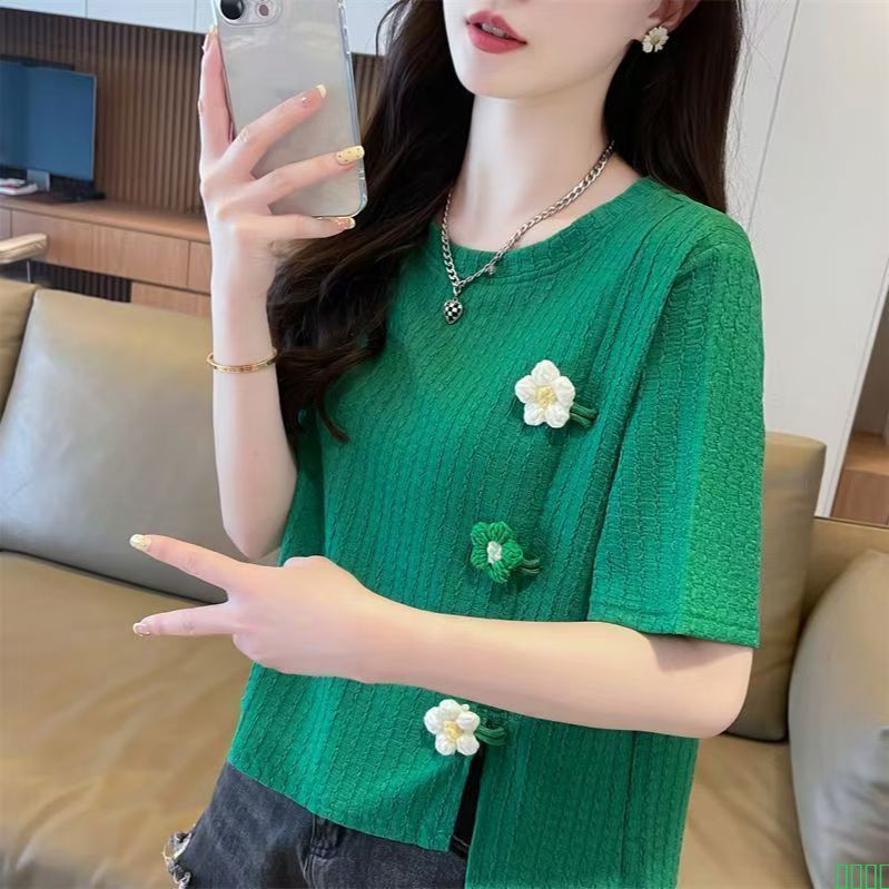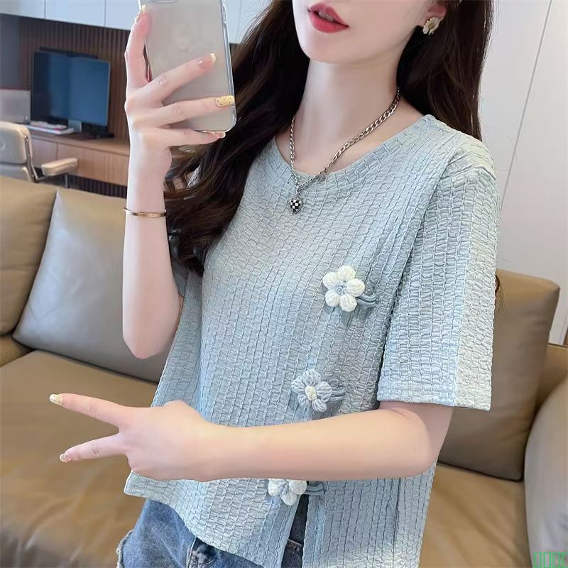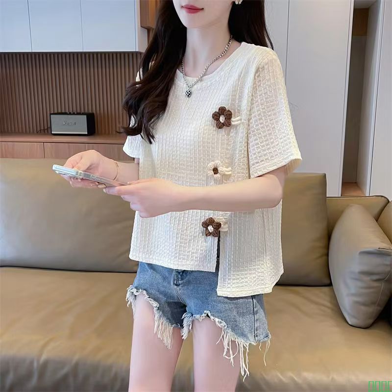 韩版遮肉大码设计感小个子短袖t恤女夏季小清新开叉百搭通勤上衣