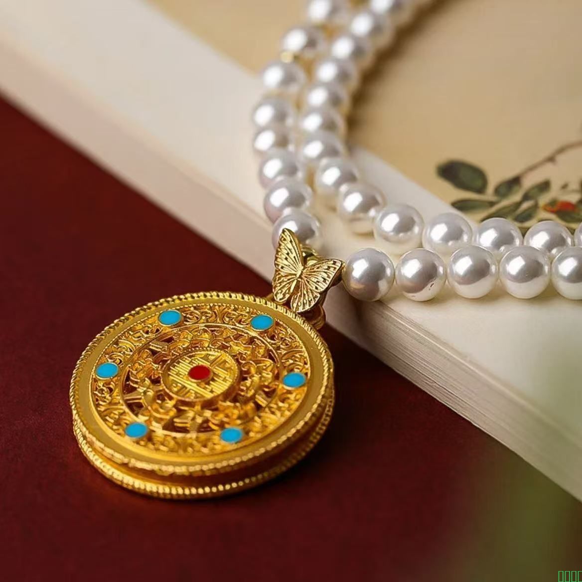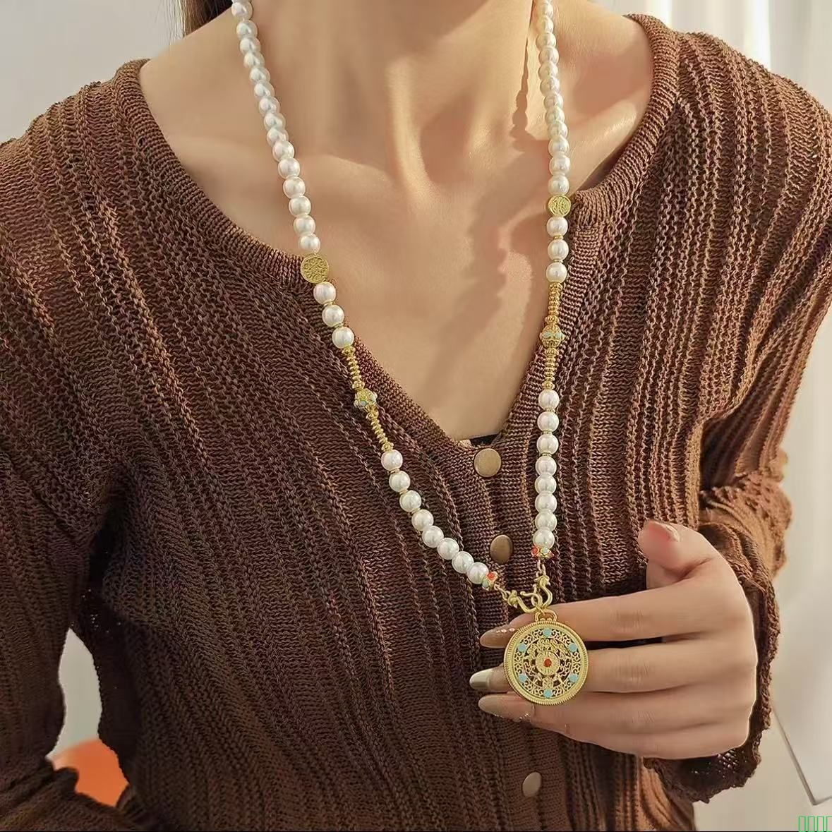 花丝古法镂空圆盘女长款白色珍珠项链毛衣链新汉服配饰女八宝罗盘