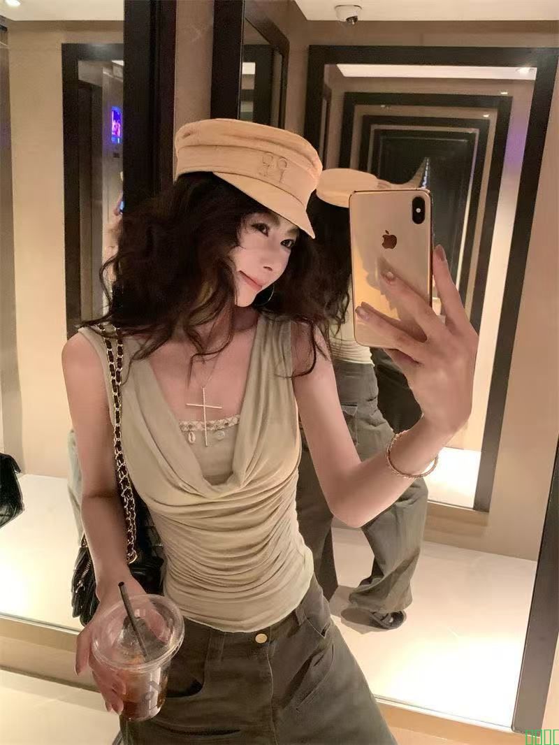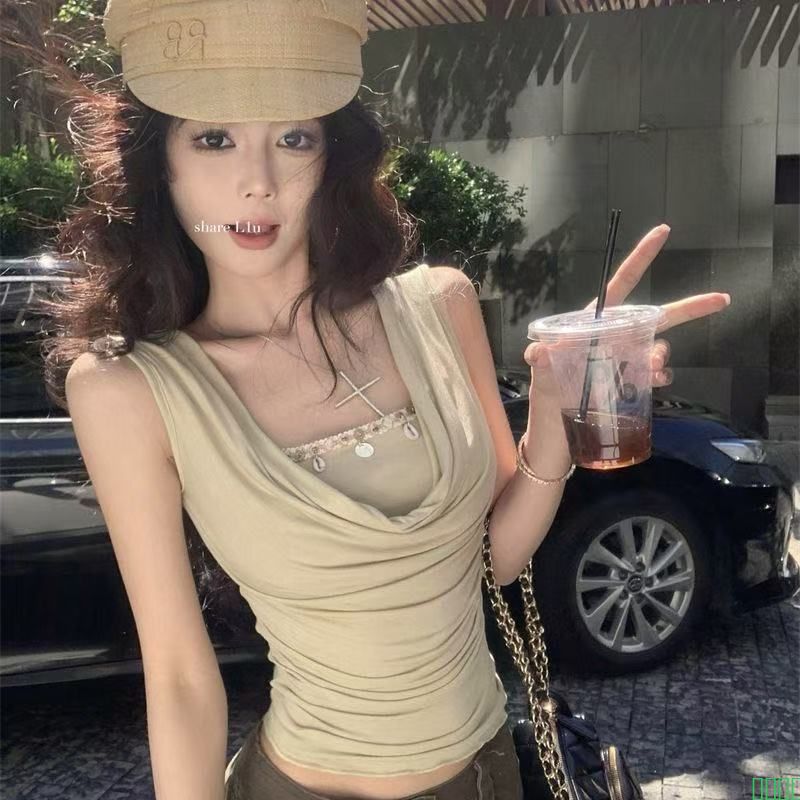 假两件收腰纯欲风短款ins无袖t恤女2025夏季新款荡领辣妹修身上衣