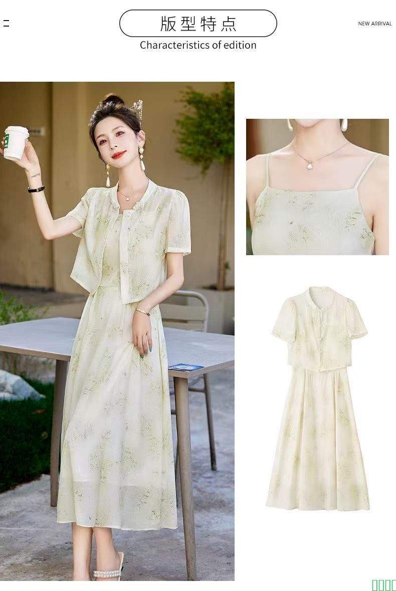 新中式吊带连衣裙两件套气质夏季女夏2024时尚国风遮肚子新款套装