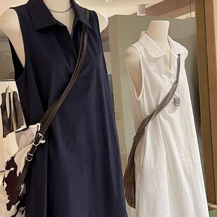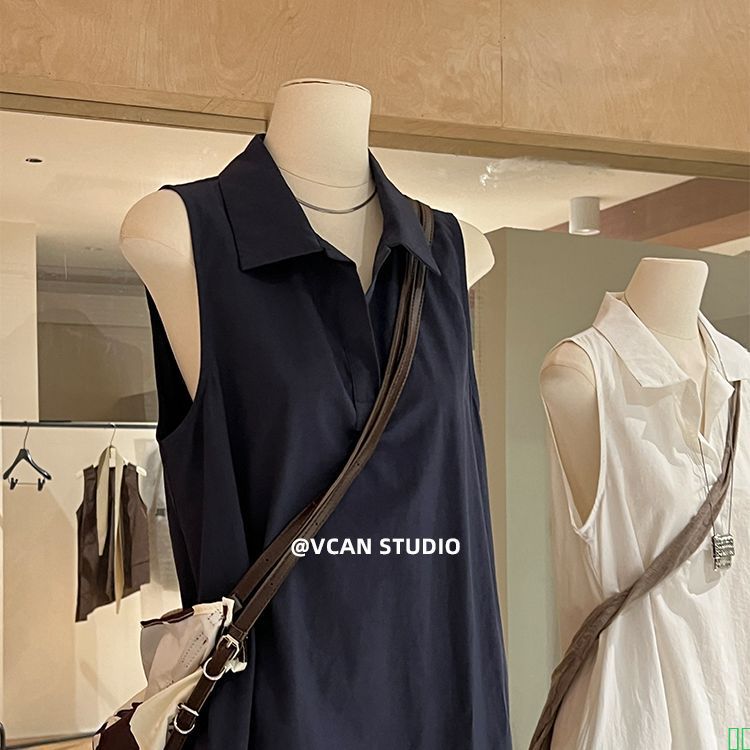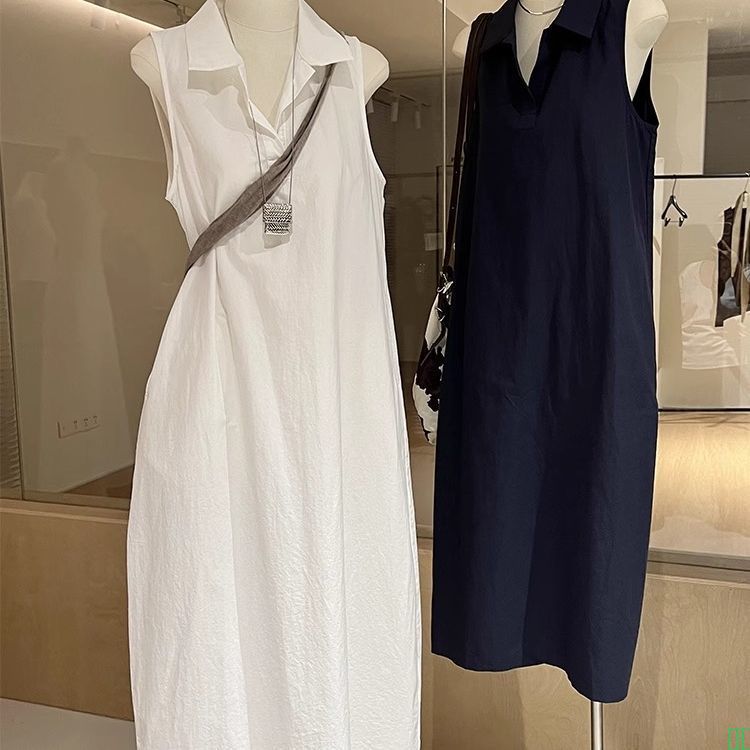 小个子POL领无袖连衣裙女2025夏日常宽松背心裙松弛感白色长裙