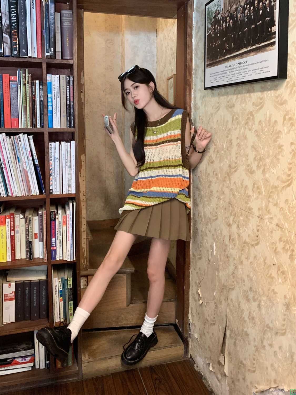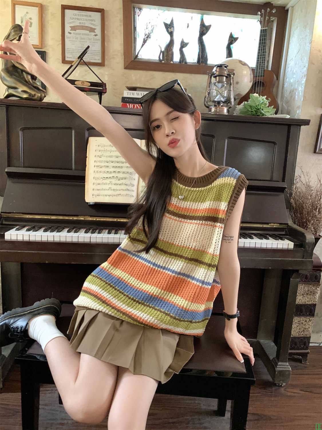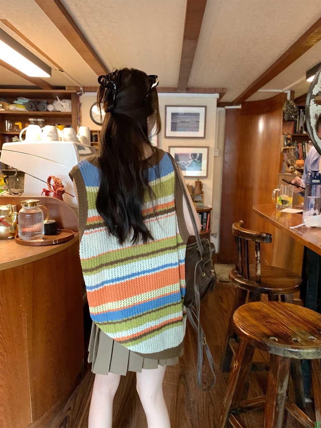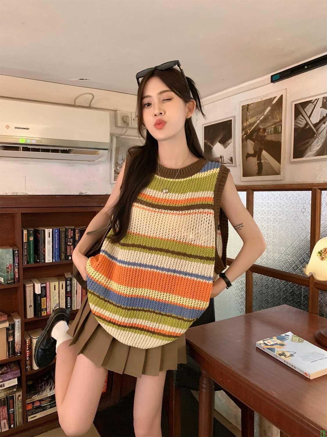 镂空条纹针织马甲背心女外穿夏季新款学院风夏天薄款撞色针织马夹