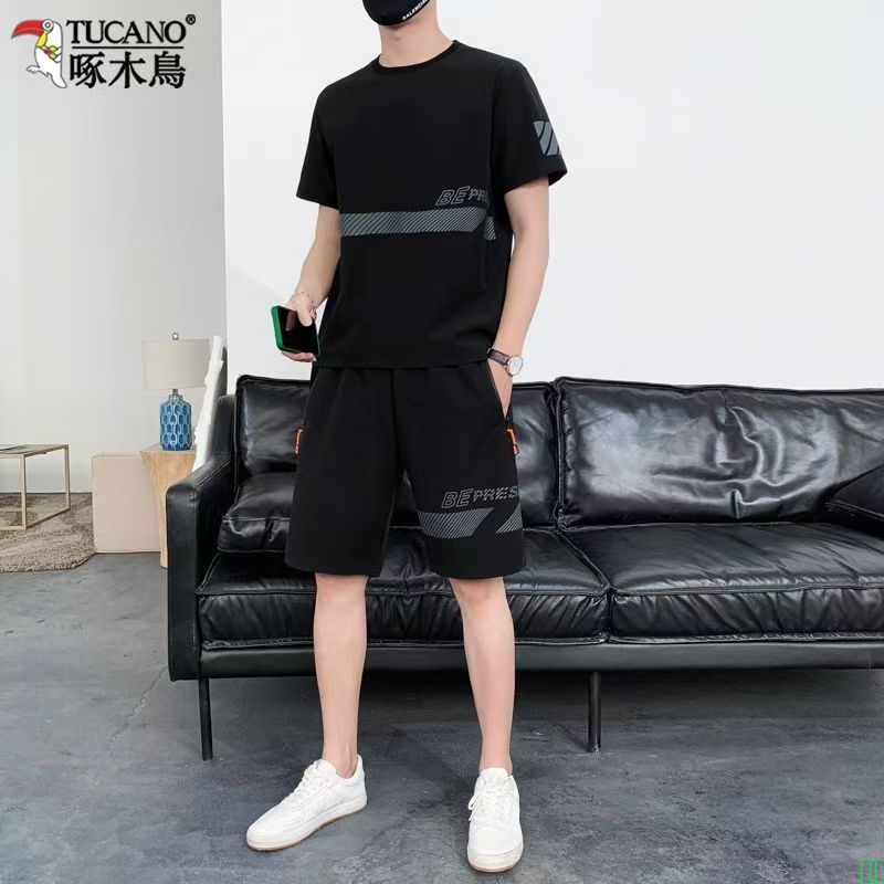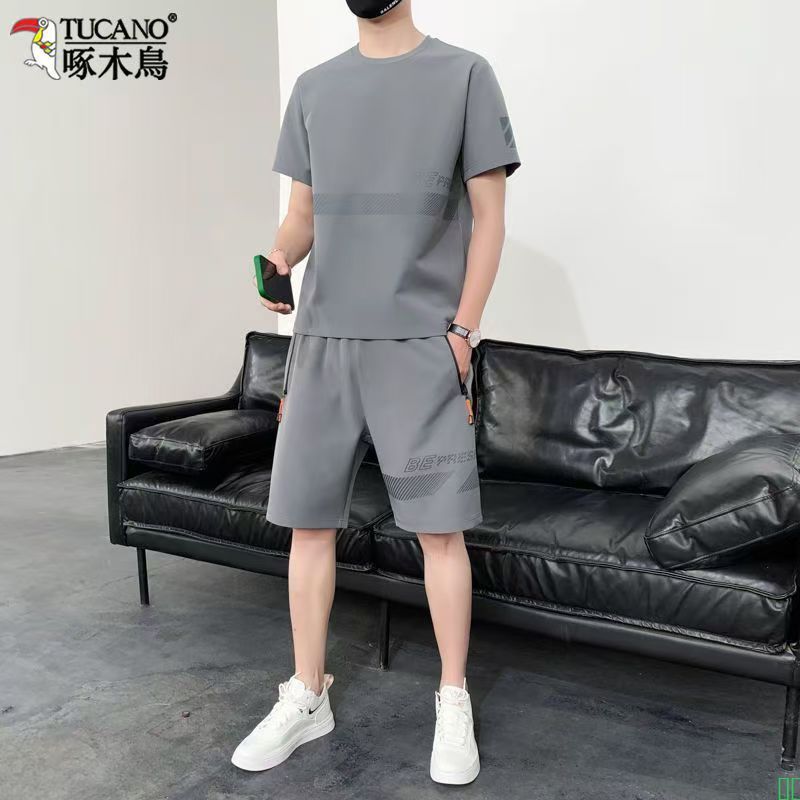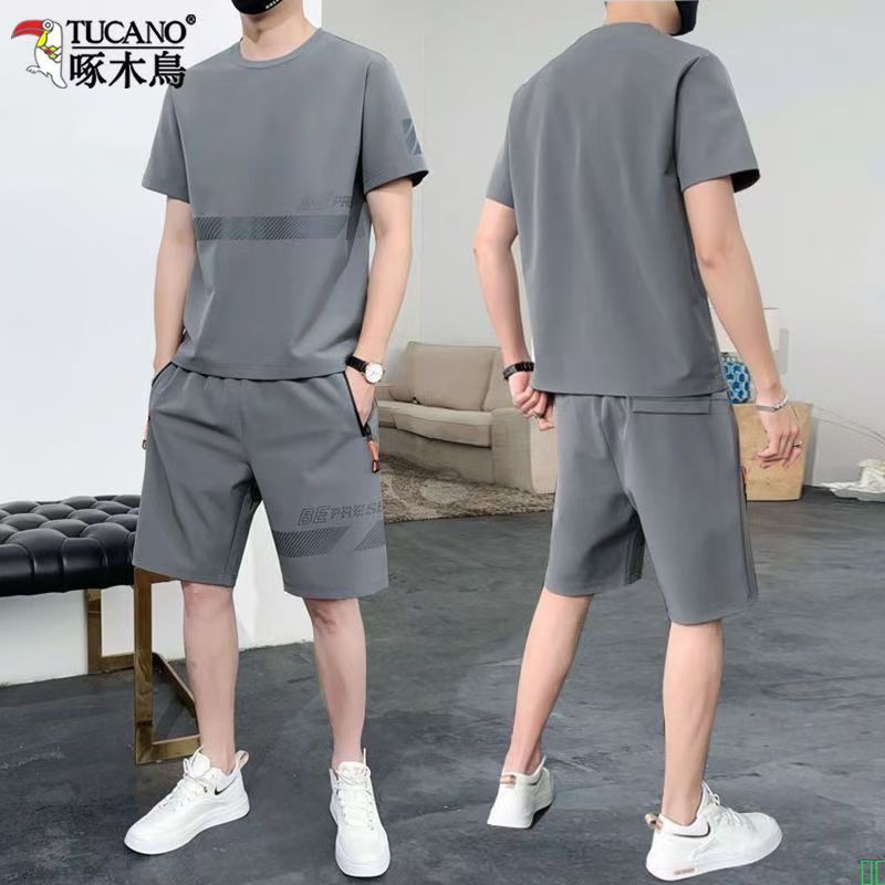 啄木鸟新品薄款冰丝短袖短裤套装休闲宽松大码潮流休闲百搭两件套