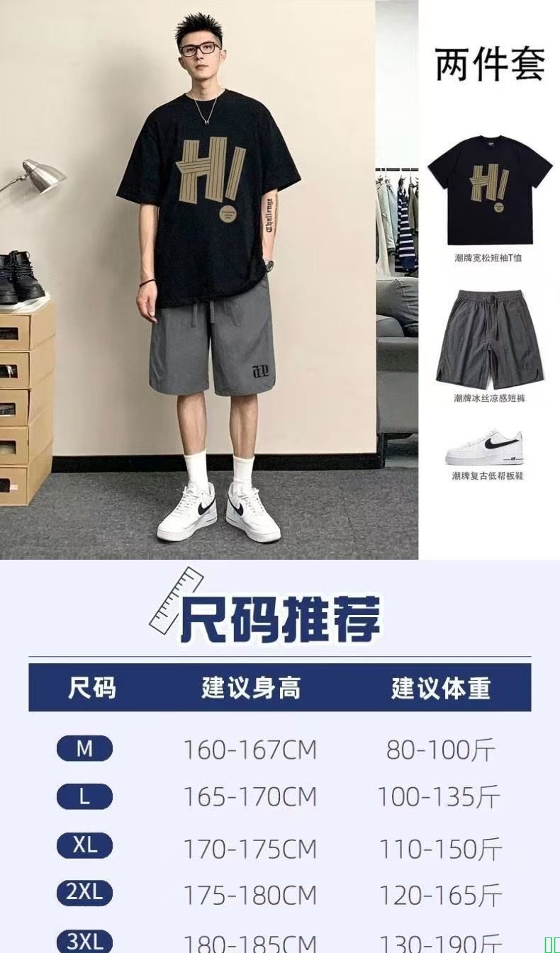 两件套Hi夏季港风个性印花短袖t恤男宽松ins潮流潮牌冰丝短裤套装