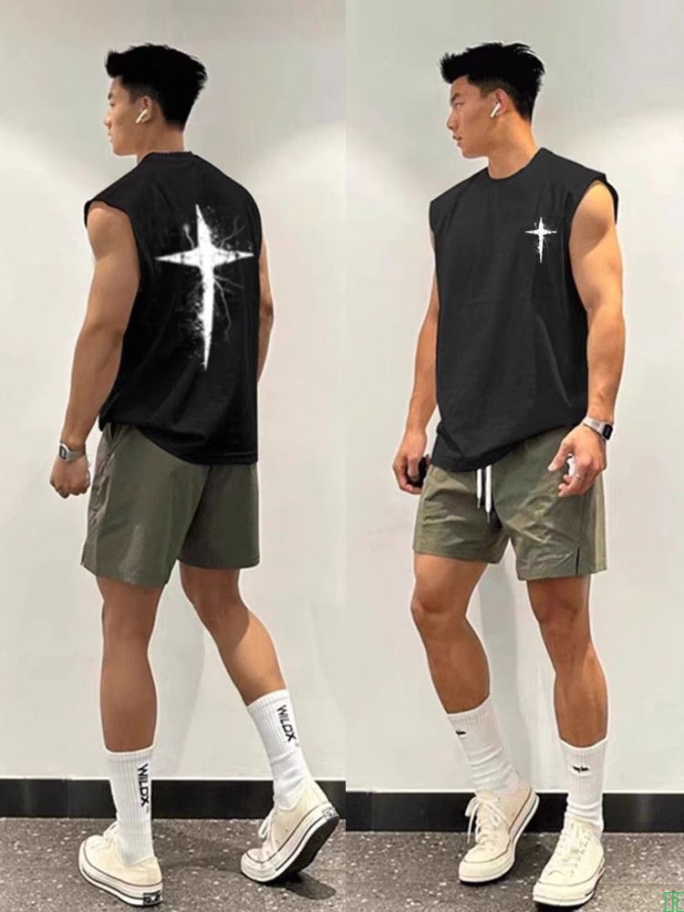 欧美式高街摇滚十字架印花背心男夏季纯棉休闲小领口坎肩无袖上衣