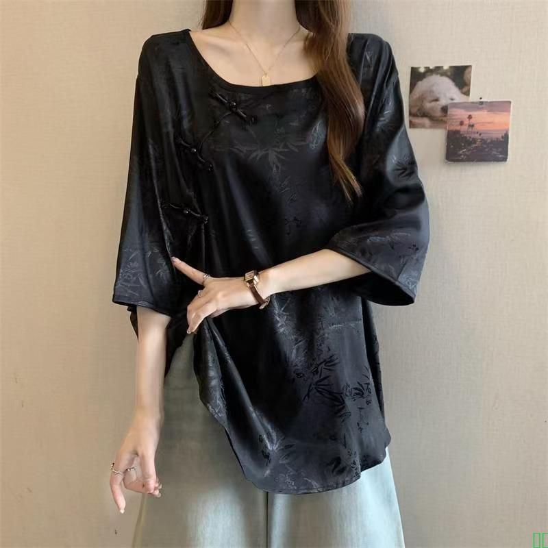胖MM国风盘扣拼接中长款上衣夏季300斤大码气质减龄宽松短袖T恤女