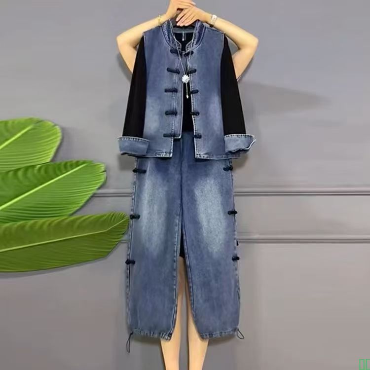 胖mm大码牛仔三件套时尚秋季新中式国风盘扣爆款气质套装显瘦洋气