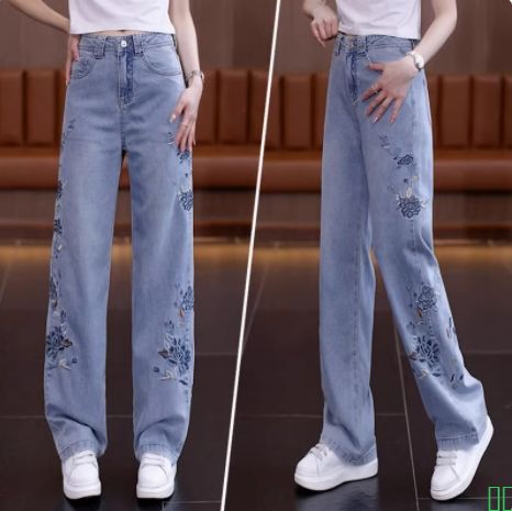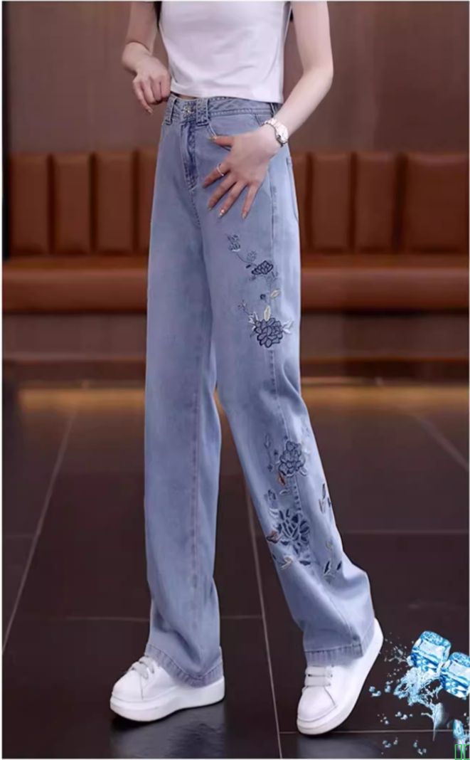 美式弯刀竹节纹阔腿牛仔裤女秋季2025新款浅色高腰显瘦直筒拖地裤