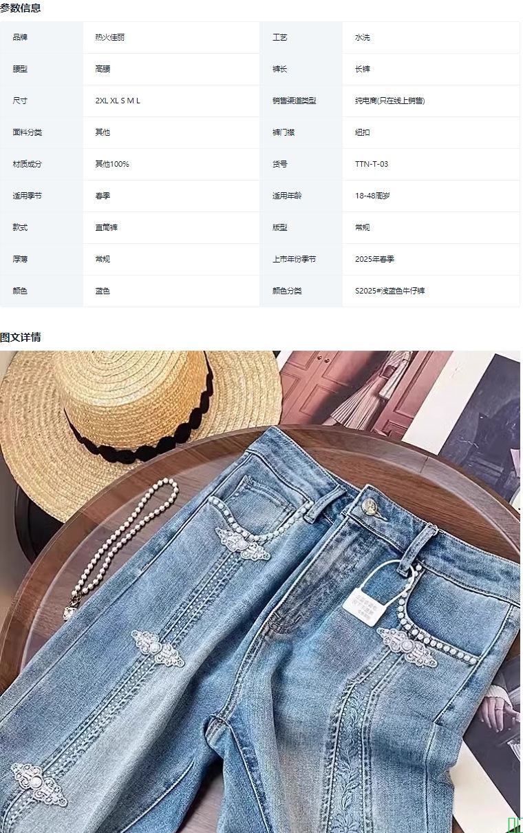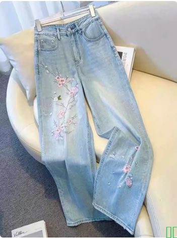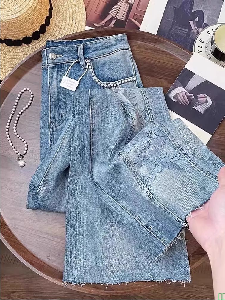浅蓝色蝴蝶结刺绣直筒牛仔裤女夏季大码胖mm高腰宽松显瘦阔腿长裤
