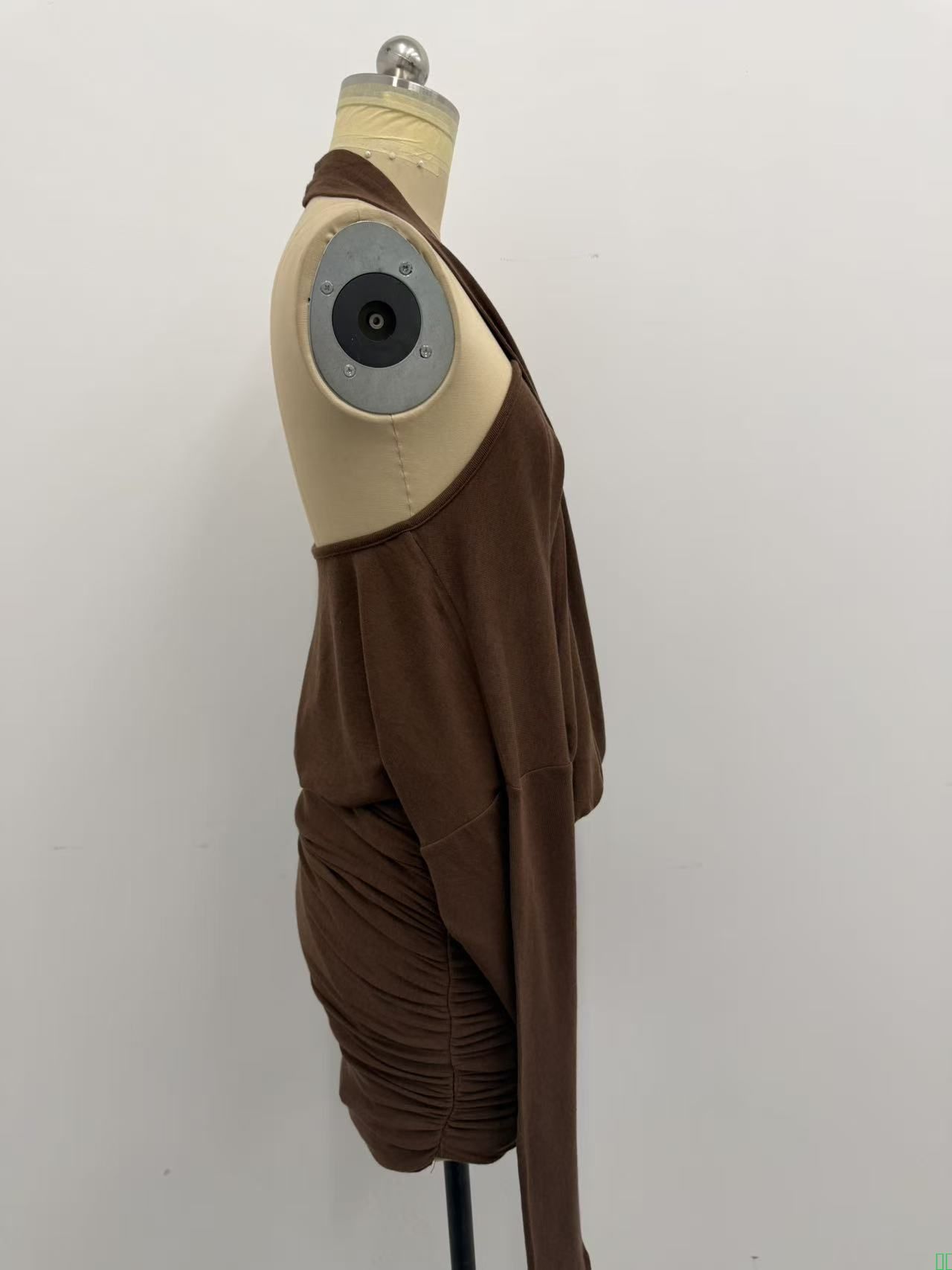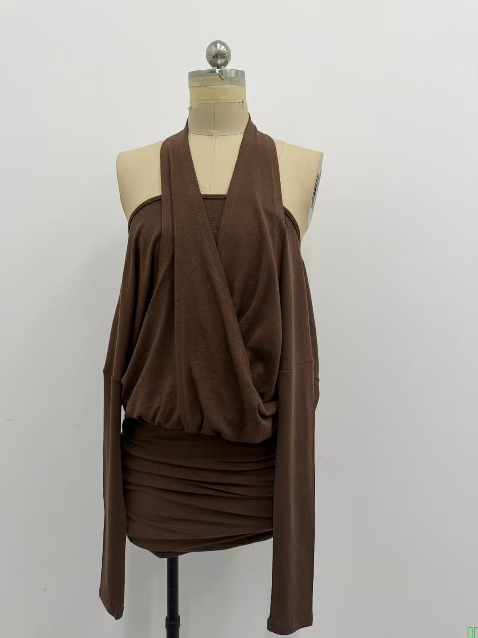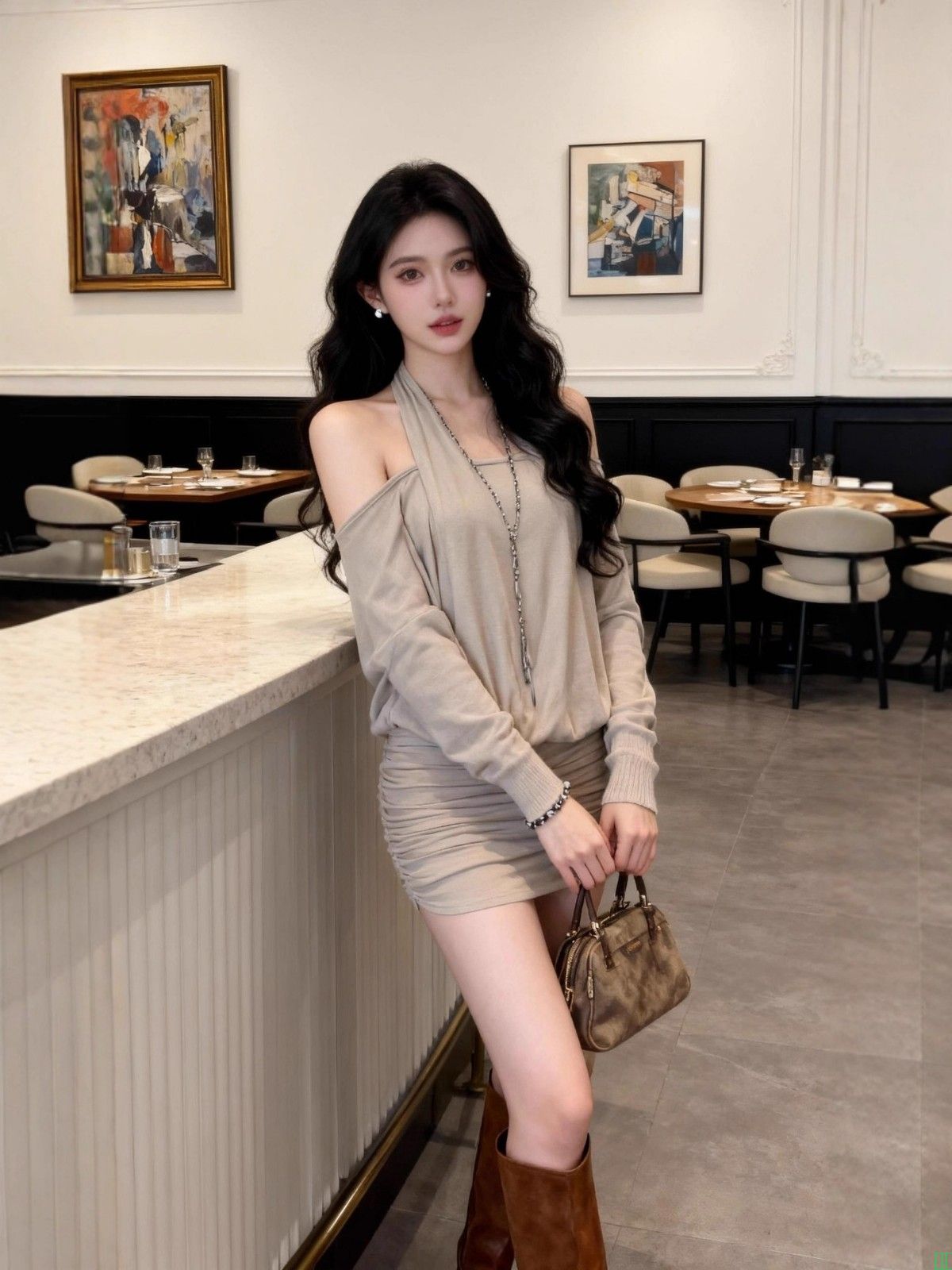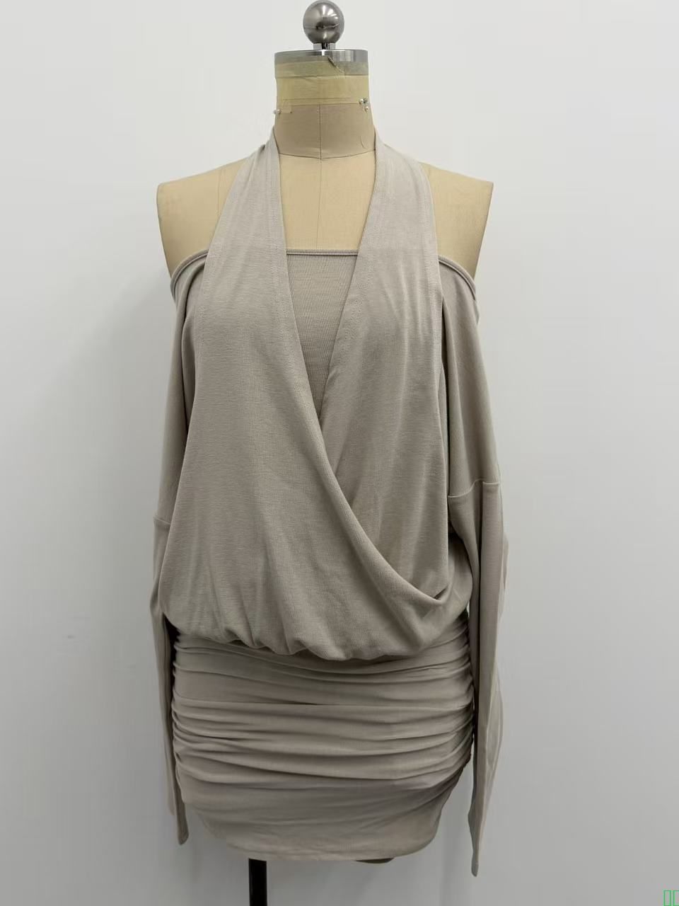 纯欲气质高级感春秋穿搭一字肩挂脖薄款长袖上衣修身显瘦连衣裙