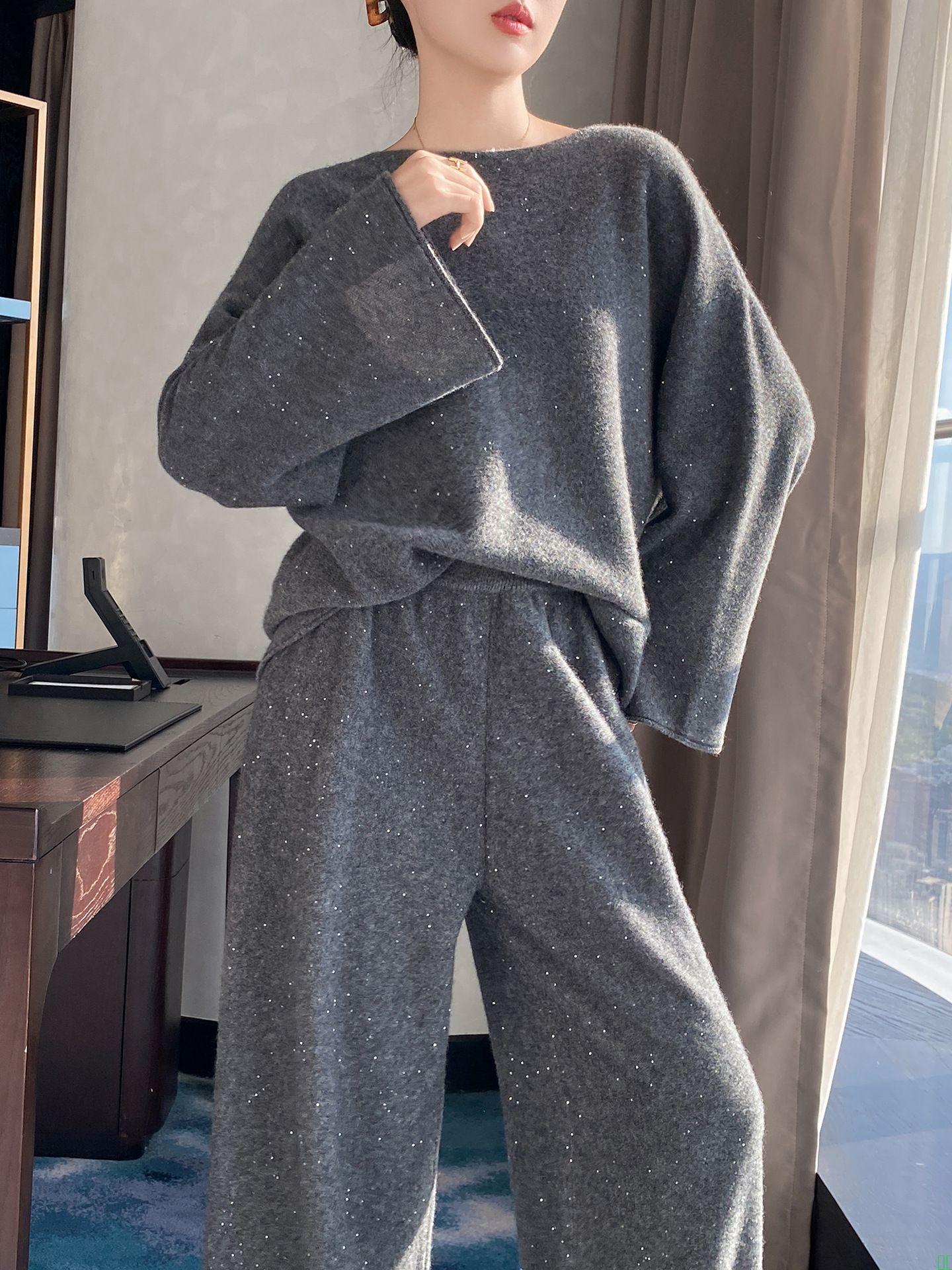 100%纯羊毛时尚套装女高领加厚套头毛衣洋气裤子两件套针织阔腿裤