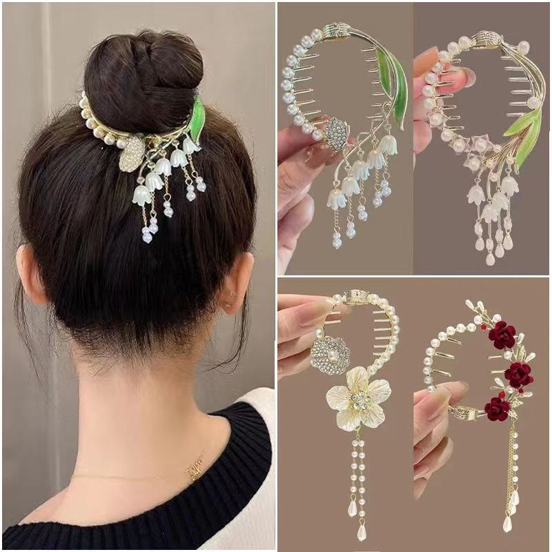 新中式古风粉色花朵流苏发簪