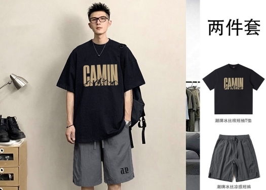 两件套山系户外字母印花凉感速干短袖T恤男宽松潮流冰丝短裤套装