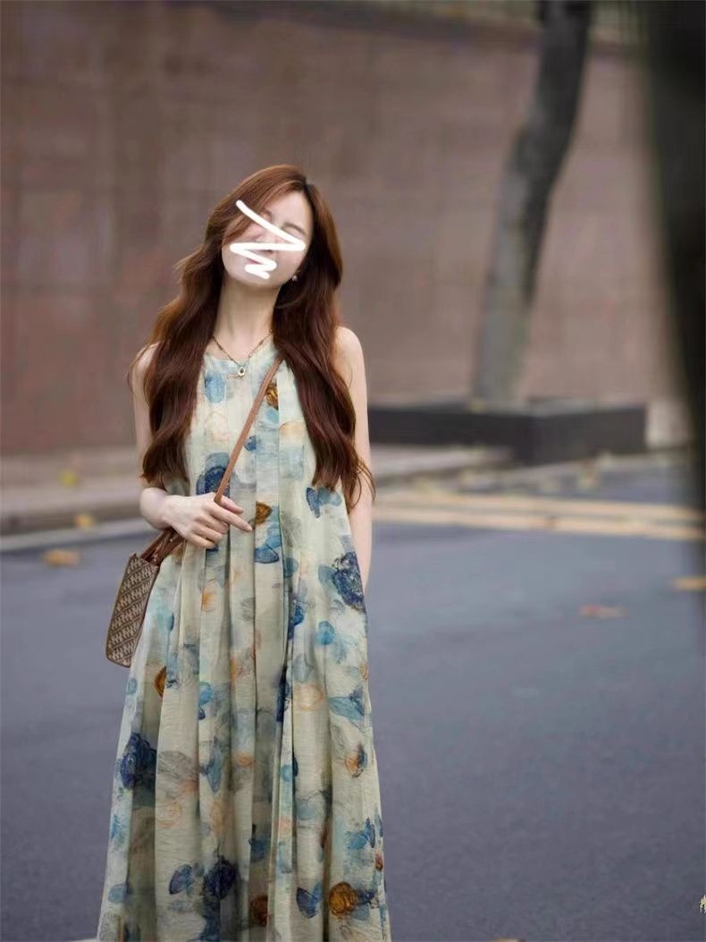 2024夏款小清新甜美碎花雪纺长袖针织吊带马甲两件套连衣裙女学生